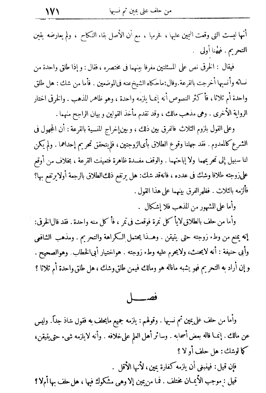 وعلى القول بلزوم الثلاث فالفرق بين ذلك، وبين إخراج المنسية بالقرعة: أن المجهول فى الشرع كالمعدوم. فقد جهلنا وقوع الطلاق بأى الزوجتين، فلم يتحقق تحريم إحداهما. ولم يكن لنا سبيل إلى تحريمهما ولا إباحتهما. والوقف مفسدة ظاهرة فتعينت القرعة، بخلاف من أوقع على زوجته طلاقاً قد شك فى عدده فإنه قد شك: هل يرتفع ذلك الطلاق بالرجعة أولا يرتفع بها؟ فألزمه بالثلاث. فظهر الفرق بينهما على هذا القول.