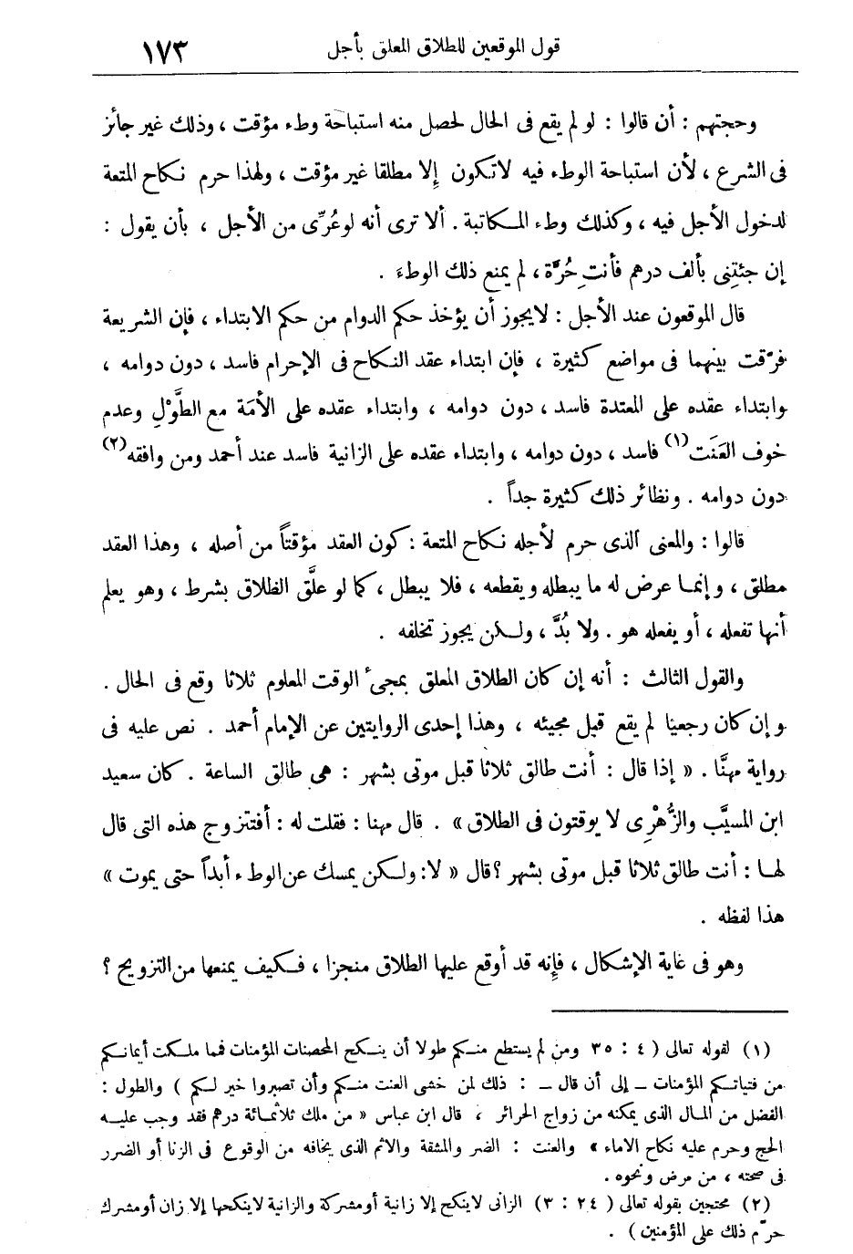 قال الموقعون عند الأجل: لا يجوز أن يؤخذ حكم الدوام من حكم الابتداء، فإن الشريعة فرقت بينهما فى مواضع كثيرة، فإن ابتداء عقد النكاح فى الإحرام فاسد دون دوامه، وابتداء عقده على المعتدة فاسد دون دوامه، وابتداء عقده على الأمة مع الطول وعدم خوف العنت فاسد، دون دوامه، وابتداء عقده على الزانية فاسد عند أحمد ومن وافقه دون دوامه. ونظائر ذلك كثيرة جداً.