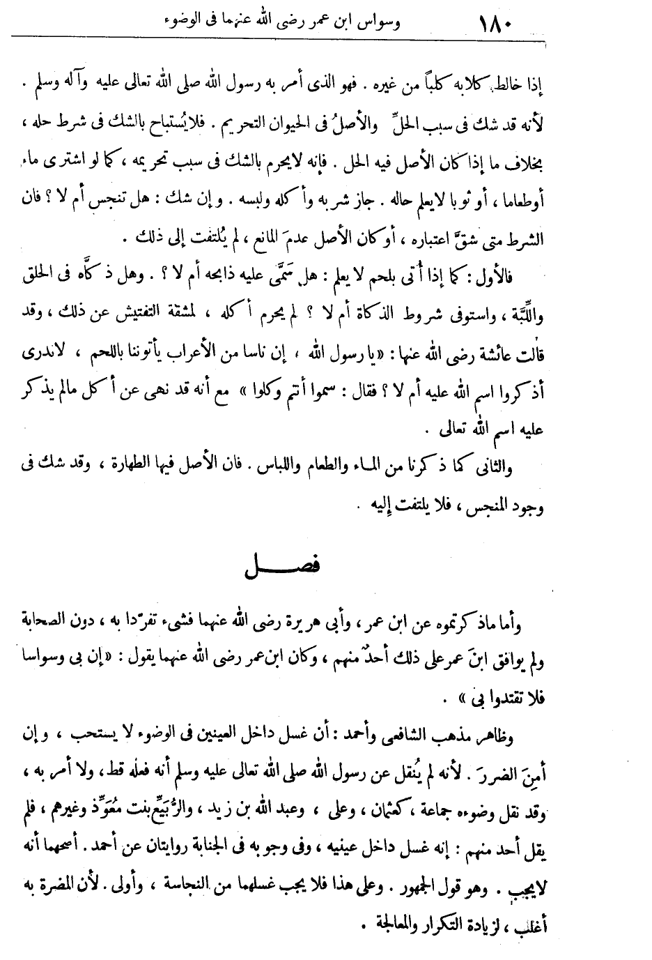 وأما ما ذكرتموه عن ابن عمر، وأبى هريرة رضى الله عنهما فشئ تفردا به، دون الصحابة ولم يوافق ابن عمر على ذلك أحد منهم، وكان ابن عمر رضى الله عنهما يقول: "إن بى وسواساً فلا تقتدوا بى".
