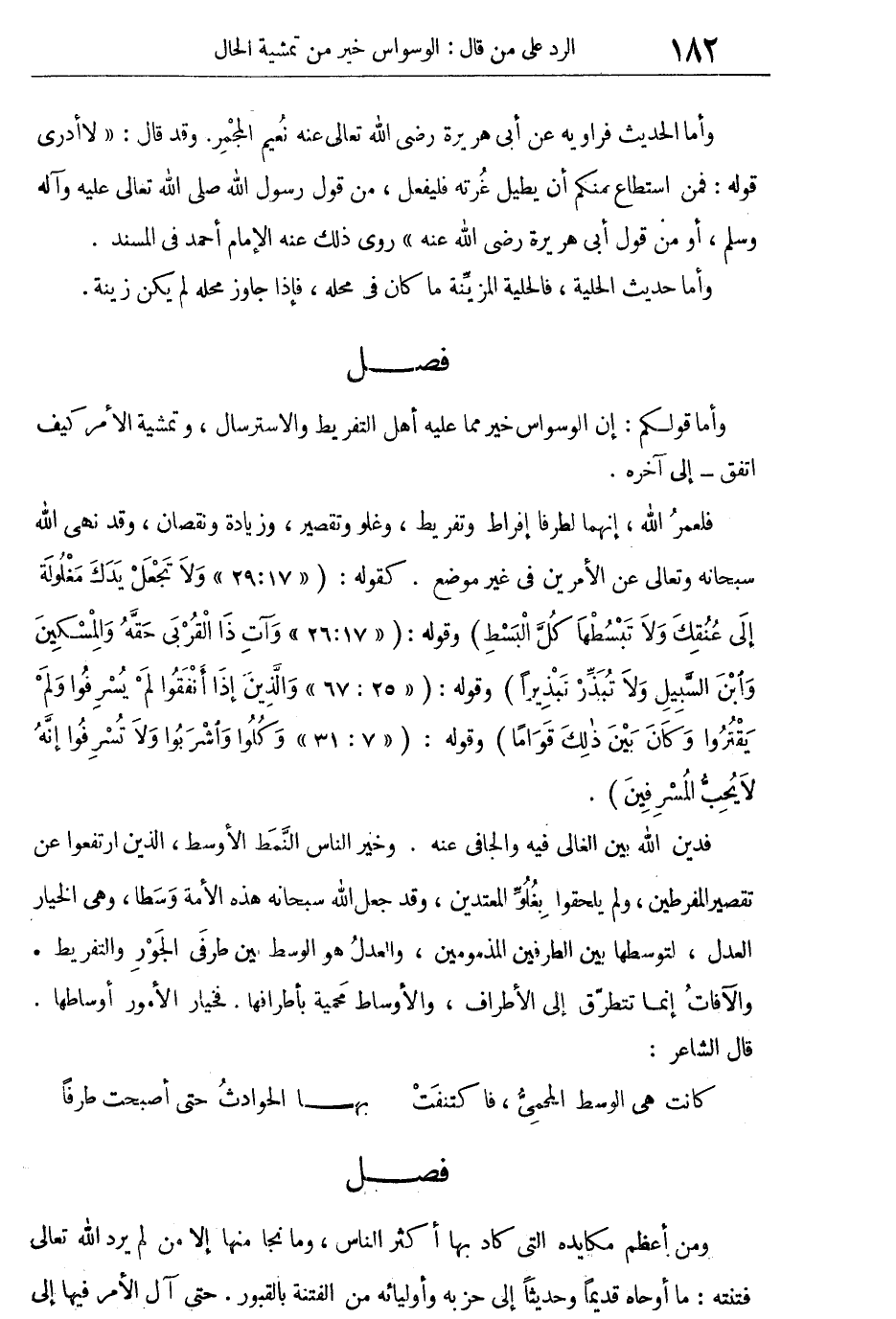 {وَلا تجْعَلْ يَدَكَ مَغْلُولَةً إِلَى عُنُقِكَ وَلا تَبْسُطْهَا كُلَّ الْبَسْطِ} [الإسراء: 29] . وَقوله: {وَآتِ ذَا الْقُرْبَى حَقّهُ وَالمِسْكِينَ وَابْنَ السَّبِيلِ وَلا تُبَذَّرْ تبذيرا} [الإسراء: 26] . وقوله: {وَالَّذِينَ إذَا أَنْفقُوا لَمْ يُسْرِفُوا وَلَمْ يَقْتُروا وَكَانَ بَيْنَ ذلِكَ قَوَاماً} [الفرقان: 67] . وقوله {وَكُلُوا وَاشْرِبوا ولا تسرفوا إِنّهُ لا يُحِبُّ المُسْرِفِينَ} [الأعراف: 31] فدين الله بين الغالى فيه والجافى عنه. وخير الناس النمط الأوسط، الذين ارتفعوا عن تقصير المفرطين، ولم يلحقوا بغلو المعتدين، وقد جعل الله سبحانه هذه الأمة وسطاً، وهى الخيار العدل، لتوسطها بين الطرفين المذمومين، والعدل هو الوسط بين طرفى الجور والتفريط. والآفات إنما ينتظرون إلى الأطراف، والأوساط محمية بأطرافها، فخيار الأمور أوساطها. قال الشاعر: