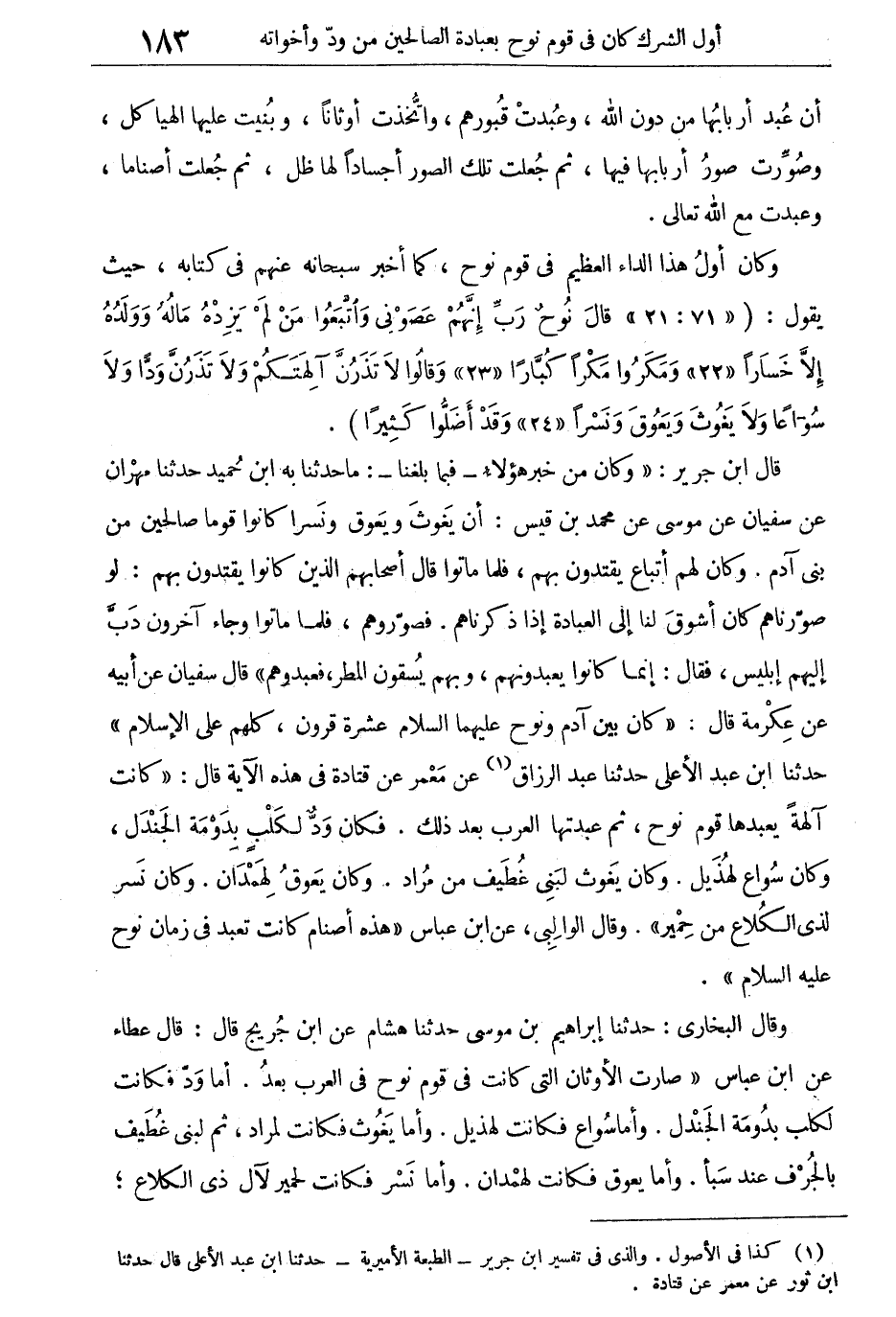 {قَالَ نُوحٌ رَب إنهم عَصَوْنِى وَاتَّبَعُوا مَنْ لَمْ يَزِدْهُ مَالُهُ وَوَلَدُهُ إِلا خَسَارًا وَمَكرُوا مَكْرًا كبَّارًا وَقَالُوا لا تَذَرُنَّ آلِهَتَكُمْ وَلا تَذَرُنَّ وَدا وَلا سُوَاعًا وَلا يَغُوثَ وَيَعُوقَ وَنَسْرًا وَقَدْ أَضَلُّوا كَثِيرًا} [نوح: 21-24] . قال ابن جرير: "وكان من خبر هؤلاء فيما بلغنا ما حدثنا به ابن حميد حدثنا مهران عن سفيان عن موسى عن محمد بن قيس: أن يغوث ويعوق ونسراً كانوا قوماً صالحين من بنى آدم. وكان لهم أتباع يقتدون بهم، فلما ماتوا قال أصحابهم الذين كانوا يقتدون بهم: لو صورّناهم كان أشوق لنا إلى العبادة إذا ذكرناهم. فصوروهم، فلما ماتوا وجاء آخرون دبّ إليهم إبليس، فقال: إنما كانوا يعبدونهم، وبهم يسقون المطر، فعبدوهم". قال سفيان عن أبيه عن عكرمة قال: "كان بين آدم ونوح عليهما السلام عشرة قرون، كلهم على الإسلام". حدثنا ابن عبد الأعلى حدثنا عبد الرزاق عن معمر عن قتادة فى هذه الآية قال: "كانت آلهة يعبدها قوم نوح، ثم عبدتها العرب بعد ذلك، فكان ودّ لكلب بدومة الجندل، وكان سواع لهذيل. وكان يغوث لبنى غطيف من مراد. وكان يعوق لهمدان. وكان نسر لذى الكلاع من حمير". وقال الوالبى، عن ابن عباس: "هذه أصنام كانت تعبد فى زمان نوح عليه السلام".