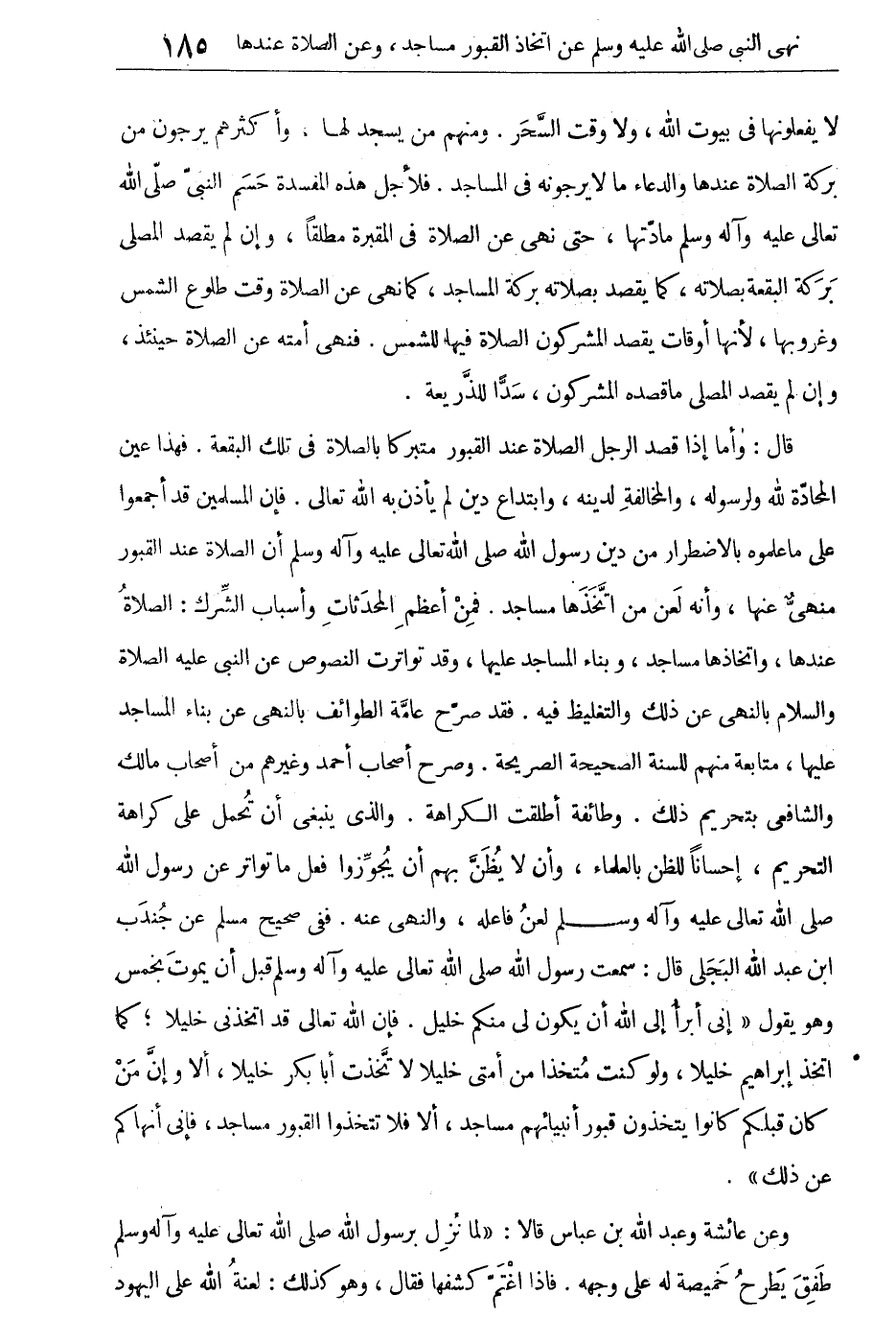 قال: وأما إذا قصد الرجل الصلاة عند القبور متبركاً بالصلاة فى تلك البقعة، فهذا عين المخادعة لله ولرسوله، والمخالفة لدينه، وابتداع دين لم يأذن به الله تعالى. فإن المسلمين قد أجمعوا على ما علموه بالاضطرار من دين رسول الله صلى الله تعالى عليه وآله وسلم أن الصلاة عند القبور منهى عنها، وأنه لعن من اتخذها مساجد. فمن أعظم المحدثات وأسباب الشرك الصلاة عندها واتخاذها مساجد، وبناء المساجد عليها. وقد تواترت النصوص عن النبى عليه الصلاة والسلام بالنهى عن ذلك والتغليظ فيه. فقد صرح عامة الطوائف بالنهى عن بناء المساجد عليها، متابعة منهم للسنة الصحيحة الصريحة. وصرح أصحاب أحمد وغيرهم من أصحاب مالك والشافعى بتحريم ذلك. وطائفة أطلقت الكراهة. والذى ينبغى أن يحمل على كراهة التحريم إحسانا للظن بالعلماء، وأن لا يظن بهم أن يجوزوا فعل ما تواتر عن رسول الله صلى الله تعالى عليه وآله وسلم لعن فاعله والنهى عنه. ففى صحيح مسلم عن جندب بن عبد الله البجلى قال: