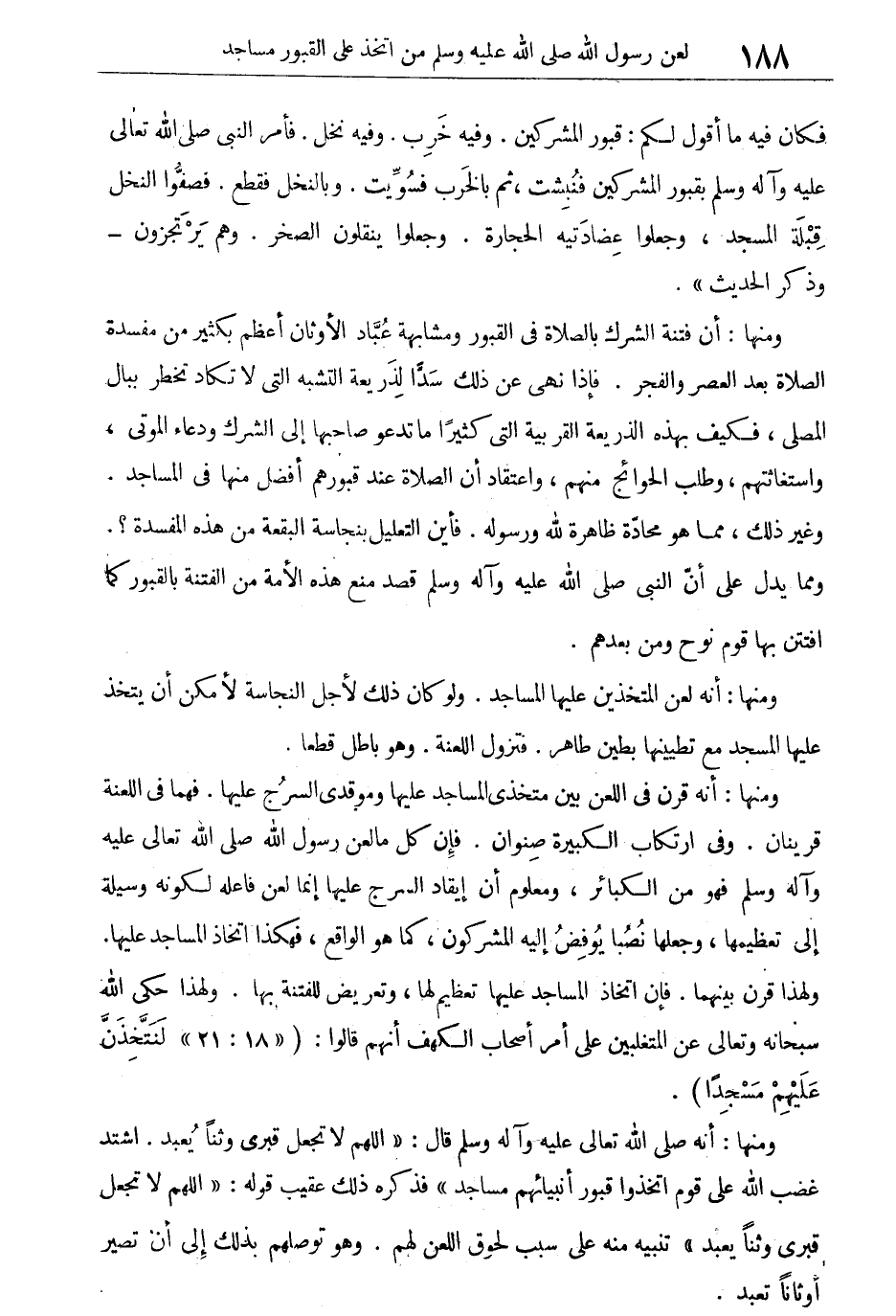 ومنها: أن فتنة الشرك بالصلاة فى القبور ومشابهة عباد الأوثان أعظم بكثير من مفسدة الصلاة بعد العصر والفجر. فإذا نهى عن ذلك سدا لذريعة التشبه التى لا تكاد تخطر ببال المصلى، فكيف بهذه الذريعة القريبة التى كثيرا ما تدعو صاحبها إلى الشرك ودعاء الموتى، واستغاثتهم، وطلب الحوائج منهم، واعتقاد أن الصلاة عند قبورهم أفضل منها فى المساجد. وغير ذلك، مما هو محادة ظاهرة لله ورسوله. فأين التعليل بنجاسة البقعة من هذه المفسدة؟ ومما يدل على أن النبى صلى الله عليه وآله وسلم قصد منع هذه الأمة من الفتنة بالقبور كما افتتن بها قوم نوح ومن بعدهم.