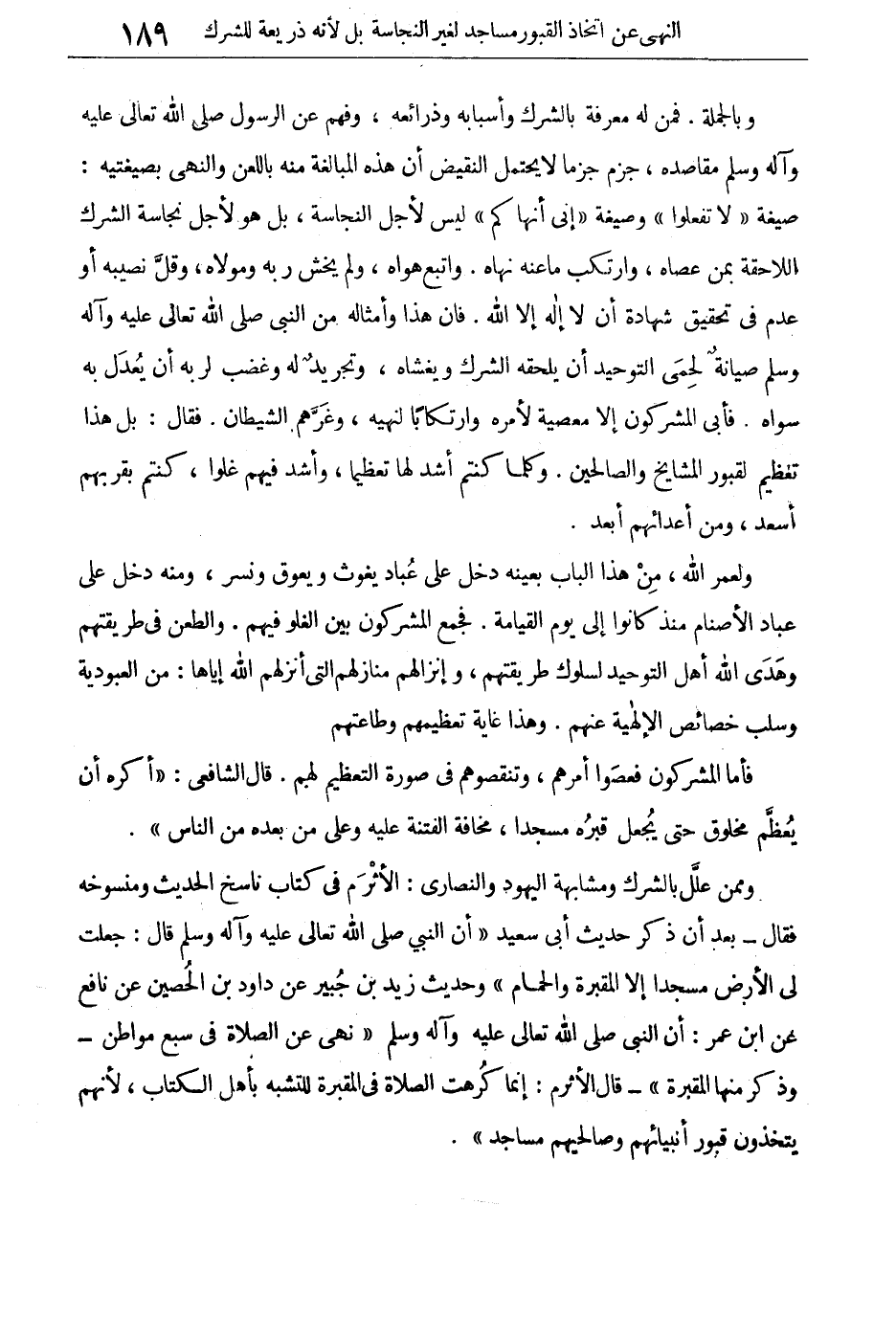 وبالجملة فمن له معرفة بالشرك وأسبابه وذرائعه، وفهم عن الرسول صلى الله تعالى عليه وآله وسلم مقاصده، جزم جزماً لا يحتمل النقيض أن هذه المبالغة منه باللعن والنهى بصيغتيه: صيغة "لا تفعلوا" وصيغة "إنى أنهاكم" ليس لأجل النجاسة، بل هو لأجل نجاسة الشرك اللاحقة بمن عصاه، وارتكب ما عنه نهاه، واتبع هواه، ولم يخش ربه ومولاه، وقل نصيبه أو عدم فى تحقيق شهادة أن لا إله إلا الله. فإن هذا وأمثاله من النبى صلى الله تعالى عليه وآله وسلم صيانة لحمى التوحيد أن يلحقه الشرك ويغشاه، وتجريد له وغضب لربه أن يعدل به سواه. فأبى المشركون إلا معصية لأمره وارتكاباً لنهيه وغرهم الشيطان. فقال: بل هذا تعظيم لقبور المشايخ والصالحين. وكلما كنتم أشد لها تعظيما، وأشد فيهم غلوا، كنتم بقربهم أسعد، ومن أعدائهم أبعد.