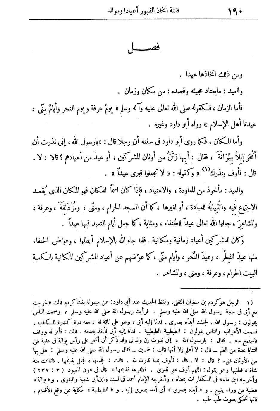 وأما المكان، فكما روى أبو داود فى سننه أن رجلا قال: "يَا رَسُولَ اللهِ، إِنى نَذَرْتُ أَنْ أَنْحَرَ إِبِلاً بِبُوَانَةَ، فقالَ: أَبِها وَثَنٌ مِنْ أوْثَانِ المُشْرِكِينَ، أَوْ عِيدٌ مِنْ أَعْياَدِهِمْ؟ قالَ: لا. قال: فَأَوْفِ بِنَذْرِكَ" وكقوله: "لا تَجْعَلُوا قَبْرِى عِيدًا".