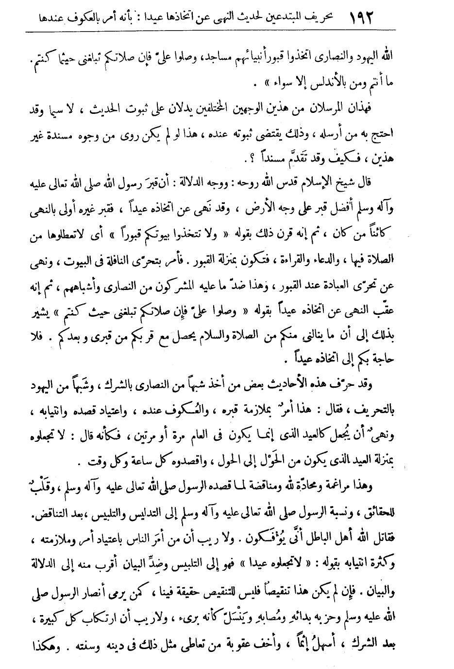 قال شيخ الإسلام قدس الله روحه: "ووجه الدلالة: أن قبر رسول الله صلى الله تعالى عليه وآله وسلم أفضل قبر على وجه الأرض، وقد نهى عن اتخاذه عيداً، فقبر غيره أولى بالنهى كائناً من كان، ثم إنه قرن ذلك بقوله "ولا تتخذوا بيوتكم قبوراً" أى لا تعطلوها من الصلاة فيها، والدعاء والقراءة، فتكون بمنزلة القبور. فأمر بتحرى النافلة فى البيوت، ونهى عن تحرى العبادة عند القبور، وهذا ضد ما عليه المشركون من النصارى وأشباههم، ثم إنه عقب النهى عن اتخاذه عيداً بقوله: "وصلوا على فإن صلاتكم تبلغنى حيث كنتم" يشير بذلك إلى أن ما ينالنى منكم من الصلاة والسلام تحصل مع قربكم من قبرى وبعدكم، فلا حاجة بكم إلى اتخاذه عيداً".
