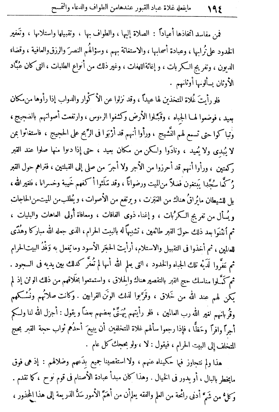 فلو رأيت غلاة المتخذين لها عيداً، وقد نزلوا عن الأكوار والدواب إذا رأوها من مكان بعيد، فوضعوا لها الجباه، وقبلوا الأرض وكشفوا الرؤوس، وارتفعت أصواتهم بالضجيج، وتباكوا حتى تسمع لهم النشيج، ورأوا أنهم قد أربوا فى الربح على الحجيج، فاستغاثوا بمن لا يبدى ولا يعيد، ونادوا ولكن من مكان بعيد، حتى إذا دنوا منها صلوا عند القبر ركعتين ورأوا أنهم قد أحرزوا من الأجر ولا أجر من صلى إلى القبلتين، فتراهم حول القبر ركعاً سجداً يبتغون فضلا من الميت ورضوانا، وقد ملئوا أكفهم خيبة وخسرانا، فلغير الله، بل للشيطان ما يراق هناك من العبرات، ويرتفع من الأصوات، ويطلب من الميت من الحاجات ويسأل من تفريج الكربات، وإغناء ذوى الفاقات، ومعافاة أولى العاهات والبليات، ثم انبثوا بعد ذلك حول القبر طائفين، تشبيها له بالبيت الحرام، الذى جعله الله مباركاً وهدى للعالمين، ثم أخذوا فى التقبيل والاستلام، أرأيت الحجر الأسود وما يفعل به وفد البيت الحرام؟ ثم عفروا لديه تلك الجباه والخدود، التى يعلم الله أنها لم تعفر كذلك بين يديه فى السجود. ثم كملوا مناسك حج القبر بالتقصير هناك والحلاق، واستمتعوا بخلاقهم من ذلك الوثن إذ لم يكن لهم عند الله من خلاق، وقربوا لذلك الوثن القرابين. وكانت صلاتهم ونسكهم وقربانهم لغير الله رب العالمين، فلو رأيتهم يهنئ بعضهم بعضاً ويقول: أجزل الله لنا ولكم أجراً وافراً وحظاً، فإذا رجعوا سألهم غلاة المتخلفين أن يبيع أحدهم ثواب حجة القبر بحج المتخلف إلى البيت الحرام، فيقول: لا، ولو بحجك كل عام.
