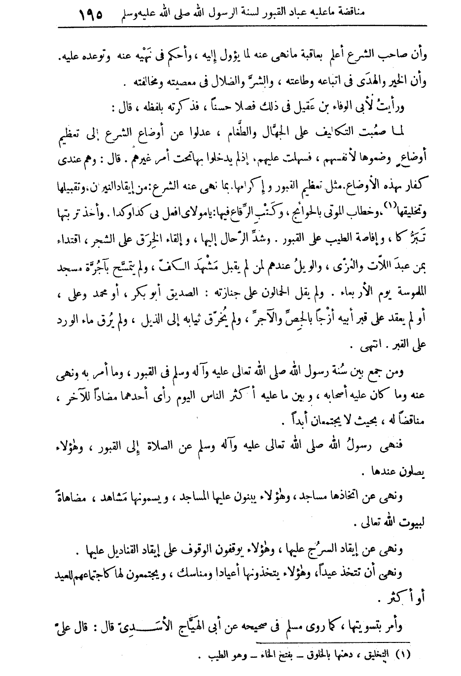 ومن جمع بين سنة رسول الله صلى الله تعالى عليه وآله وسلم فى القبور، وما أمر به ونهى عنه وما كان عليه أصحابه، وبين ما عليه أكثر الناس اليوم رأى أحدهما مضاداً للآخر، مناقضاً له، بحيث لا يجتمعان أبداً.
