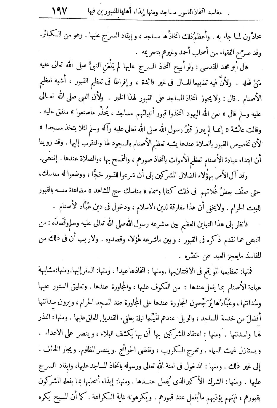 قال أبو محمد المقدسى: "ولو أبيح اتخاذ السرج عليها لم يلعن النبى صلى الله تعالى عليه من فعله. ولأن فيه تضييعا للمال فى غير فائدة، وإفراطاً فى تعظيم القبور، أشبه تعظيم الأصنام". قال: "ولا يجوز اتخاذ المساجد على القبور لهذا الخبر. ولأن النبى صلى الله تعالى عليه وسلم قال: "لعن الله اليهود اتخذوا قبور أنبيائهم مساجد، يحذر ما صنعوا" متفق عليه. وقالت عائشة: "إنما لم يبرز قبر رسول الله صلى الله تعالى عليه وآله وسلم لئلا يتخذ مسجداً" لأن تخصيص القبور بالصلاة عندها يشبه تعظيم الأصنام بالسجود لها والتقرب إليها. وقد روينا أن ابتداء عبادة الأصنام تعظيم الأموات باتخاذ صورهم، والتمسح بها، والصلاة عندها". انتهى.