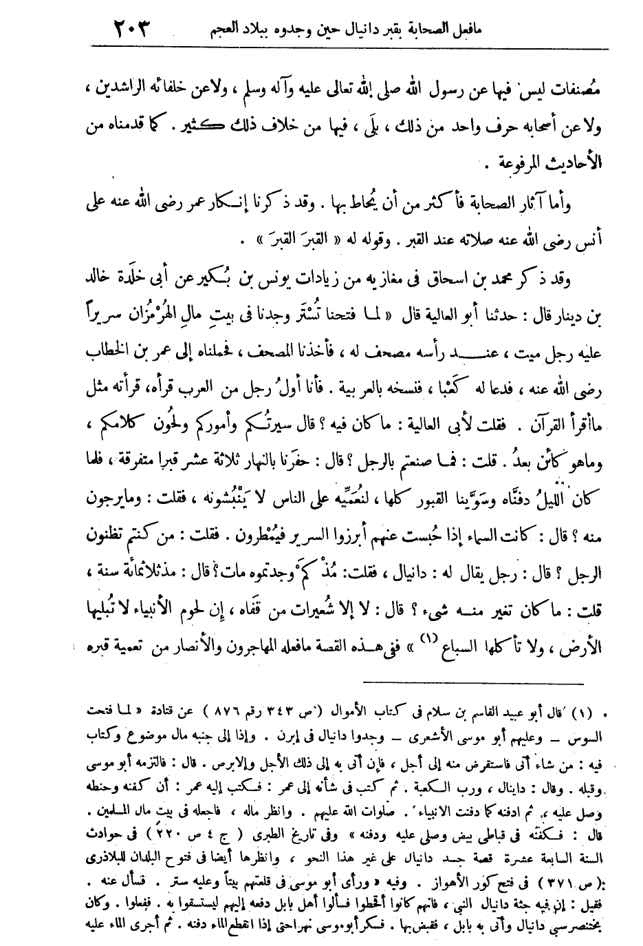 وقد ذكر محمد بن إسحاق فى مغازيه من زيادات يونس بن بكير عن أبى خلدة خالد بن دينار قال: حدثنا أبو العالية قال: "لما فتحنا تستر وجدنا فى بيت مال الهرمزان سريرا عليه رجل ميت، عند رأسه مصحف له، فأخذنا المصحف، فحملناه إلى عمر بن الخطاب رضى الله عنه، فدعا له كعباً، فنسخه بالعربية. فأنا أول رجل من العرب قرأه، قرأته مثل ما أقرأ القرآن. فقلت لأبى العالية: ما كان فيه؟ قال سيرتكم وأموركم ولحون كلامكم. وما هو كائن بعد. قلت: فما صنعتم بالرجل؟ قال: حفرنا بالنهار ثلاثة عشر قبراً متفرقة، فلما كان الليل دفناه وسوينا القبور كلها، لنعميه على الناس لا ينبشونه، فقلت: وما يرجون منه؟ قال: كانت السماء إذا حبست عنهم أبرزوا السرير فيمطرون. فقلت من كنتم تظنون الرجل؟ قال: رجل يقال له: دانيال، فقلت: مُذْ كم وجدتموه مات؟ قال: مذ ثلاثمائة سنة، قلت: ما كان تغير منه شىء؟ قال: لا، إلا شعيرات من قفاه، إن لحوم الأنبياء لا تبليها الأرض، ولا تأكلها السباع" ففى هذه القصة ما فعله المهاجرون والأنصار من تعمية قبره