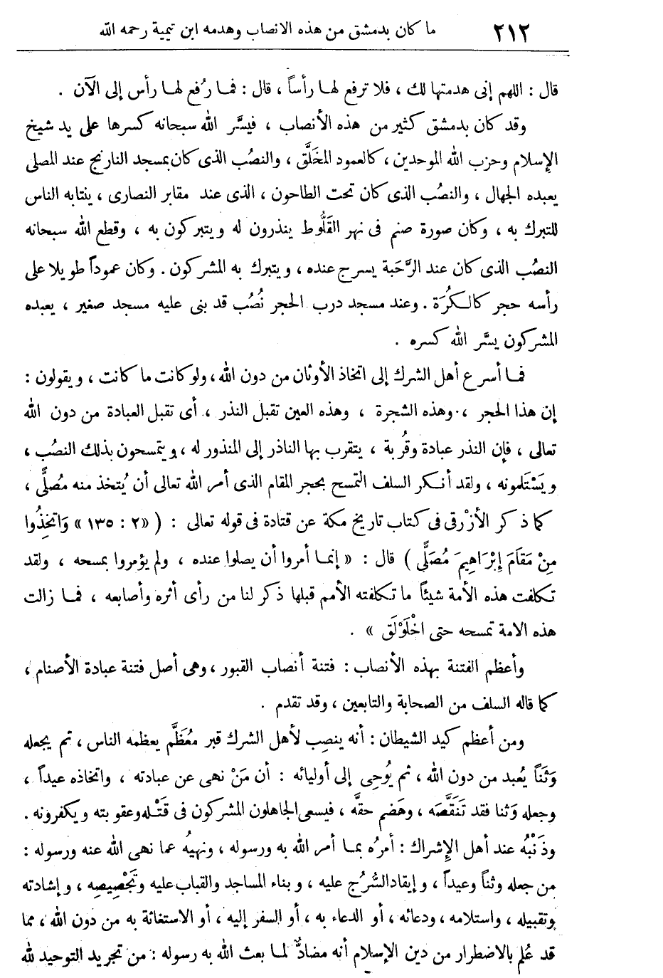 وقد كان بدمشق كثير من هذه الأنصاب، فيسر الله سبحانه كسرها على يد شيخ الإسلام وحزب الله الموحدين، كالعمود المخلق، والنصب الذى كان بمسجد النارنج عند المصلى يعبده الجهال، والنصب الذى كان تحت الطاحون الذى عند مقابر النصارى ينتابه الناس للتبرك به، وكان صورة صنم فى نهر القلوط ينذرون له ويتبركون به، وقطع الله سبحانه النصب الذى كان عند الرحبة يسرج عنده، ويتبرك به المشركون. وكان عموداً طويلاً على رأسه حجر كالكرة. وعند مسجد درب الحجر نصب قد بنى عليه مسجد صغير، يعبده المشركون يسر الله كسره.