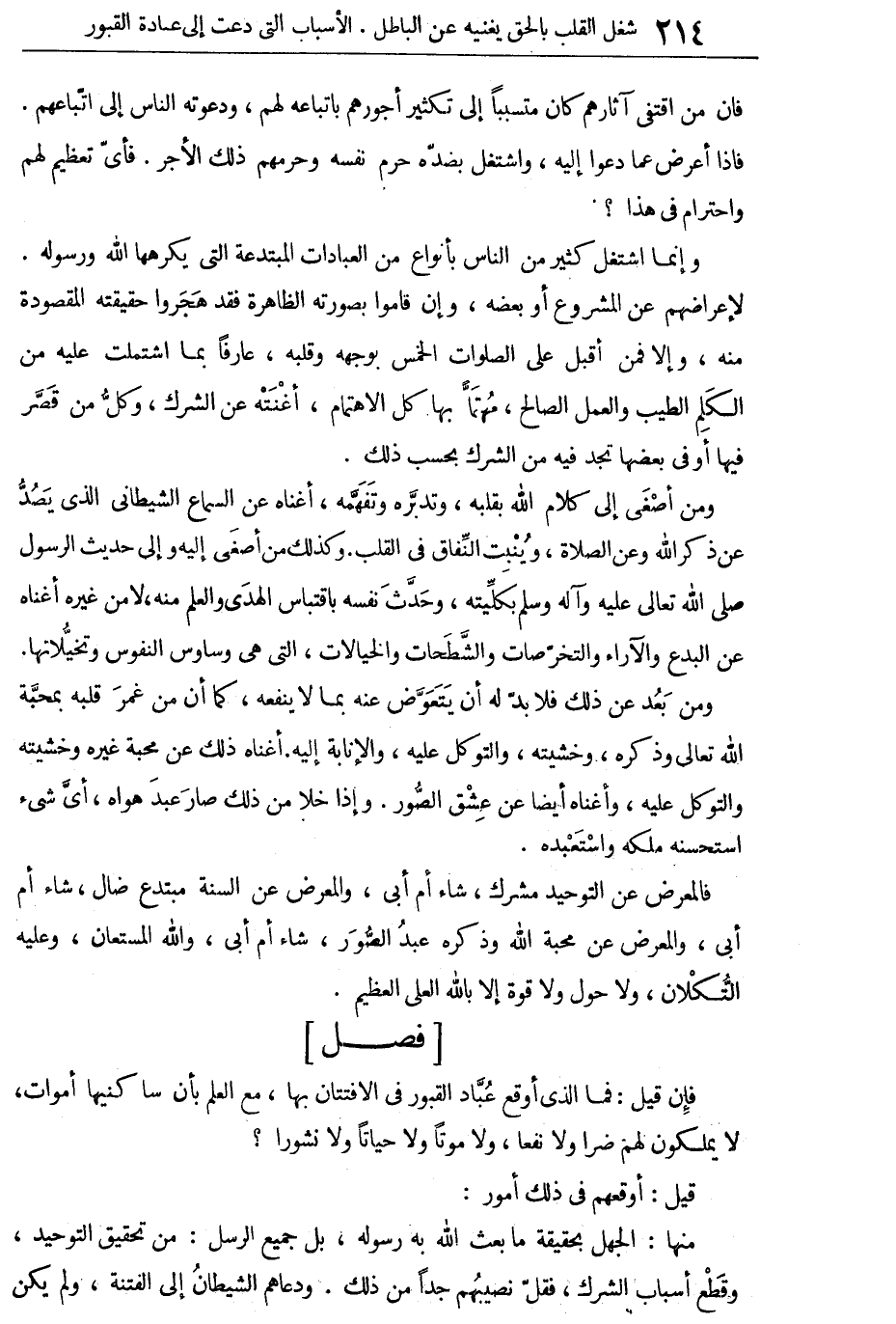 وإنما اشتغل كثير من الناس بأنواع من العبادات المبتدعة التى يكرهها الله ورسوله لإعراضهم عن المشروع أو بعضه، وإن قاموا بصورته الظاهرة فقد هجروا حقيقته المقصودة منه، وإلا فمن أقبل على الصلوات الخمس بوجهه وقلبه، عارفاً بما اشتملت عليه من الكلام الطيب والعمل الصالح، مهتما بها كل الاهتمام، أغنته عن الشرك، وكل من قصر فيها أو فى بعضها تجد فيه من الشرك بحسب ذلك.