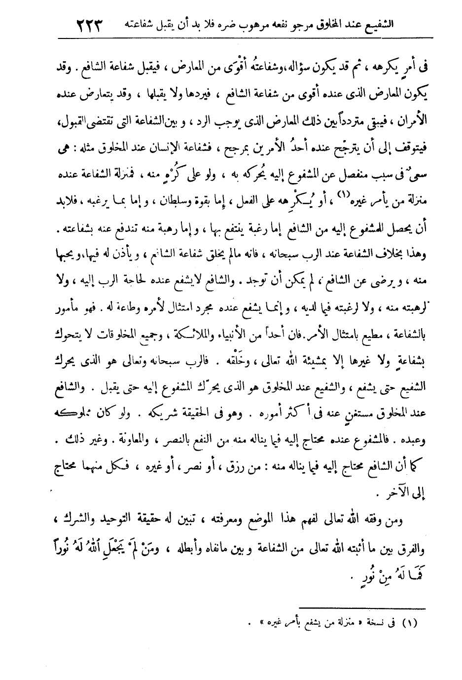 ومن وفقه الله تعالى لفهم هذا الموضع ومعرفته، تبين له حقيقة التوحيد والشرك، والفرق بين ما أثبته الله تعالى من الشفاعة وبين ما نفاه وأبطله، {وَمَنْ لَمْ يَجْعَلِ اللهُ لَهُ نوراً فماله مِنْ نُورٍ} [النور: 40] .