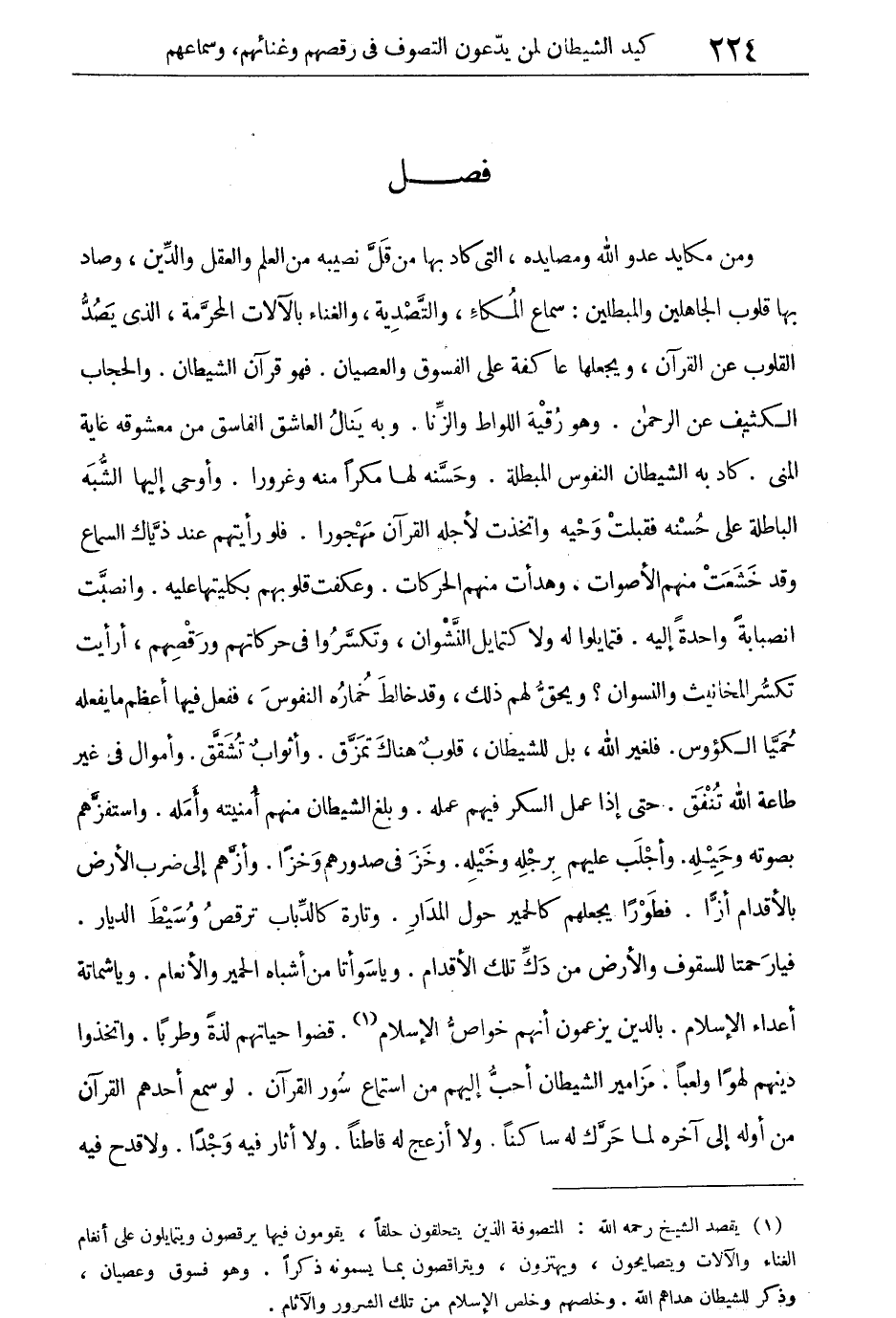 ومن مكايد عدو الله ومصايده، التى كاد بها من قل نصيبه من العلم والعقل والدين، وصاد بها قلوب الجاهلين والمبطلين، سماع المكاء، والتصدية، والغناء بالآلات المحرمة، الذى يصد القلوب عن القرآن، ويجعلها عاكفة على الفسوق والعصيان، فهو قرآن الشيطان، والحجاب الكثيف عن الرحمن، وهو رقية اللواط والزنا، وبه ينال العاشق الفاسق من معشوقة غاية المنى، كاد به الشيطان النفوس المبطلة، وحسنه لها مكراً منه وغروراً، وأوحى إليها الشبه الباطلة على حسنه فقبلت وحيه واتخذت لأجله القرآن مهجوراً، فلو رأيتهم عند ذياك السماع وقد خشعت منهم الأصوات، وهدأت منهم الحركات، وعكفت قلوبهم بكليتها عليه، وانصبت انصبابة واحدة إليه، فتمايلوا له ولا كتمايل النشوان، وتكسروا فى حركاتهم ورقصهم، أرأيت تكسر المخانيث والنسوان؟ ويحق لهم ذلك، وقد خالط خمارة النفوس، ففعل فيها أعظم ما تفعله حُمَّيه الكؤوس، فلغير الله، بل الشيطان، قلوب هناك تمزق، وأثواب تشقق، وأموال فى غير طاعة الله تنفق، حتى إذا عمل السكر فيهم عمله، وبلغ الشيطان منهم أمنيته وأمله، واستفزهم بصوته وحيله، وأجلب عليهم برجله وخيله، وخَزَ فى صدورهم وخزاً. وأزَّهم إلى ضرب الأرض بالأقدام أزا، فطورا يجعلهم كالحمير حول المدار، وتارة كالذباب ترقص وسُيَطْ الديار. فيا رحمتا للسقوف والأرض من دك تلك الأقدام، ويا سوأتا من أشباه الحمير والأنعام، وياشماتة أعداء الإسلام، بالذين يزعمون أنهم خواص الإسلام قضوا حياتهم لذة وطرباً، واتخذوا دينهم لهواً ولعباً، مزامير الشيطان أحب إليهم من استماع سور القرآن، لو سمع أحدهم القرآن من أوله إلى آخره لما حرك له ساكناً، ولا أزعج له قاطنا، ولا أثار فيه وجداً، ولا قدح فيه