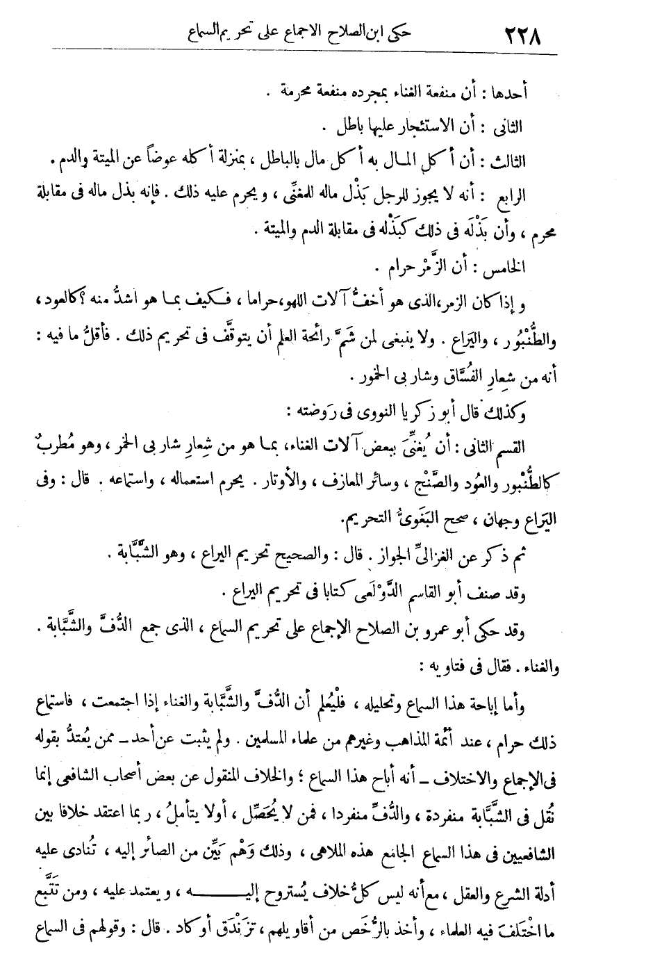 وقد حكى أبو عمرو بن الصلاح الإجماع على تحريم السماع، الذى جمع الدف والشبابة. والغناء. فقال فى فتاويه: