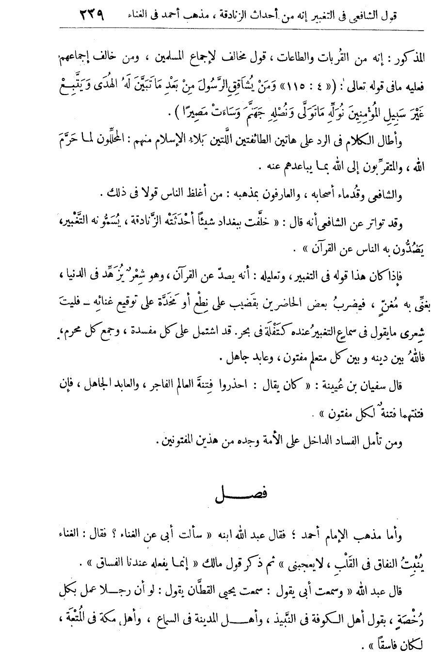 وقد تواتر عن الشافعى أنه قال: "خلفت ببغداد شيئاً أحدثته الزنادقة، يسمونه التغبير، يصدون به الناس عن القرآن".