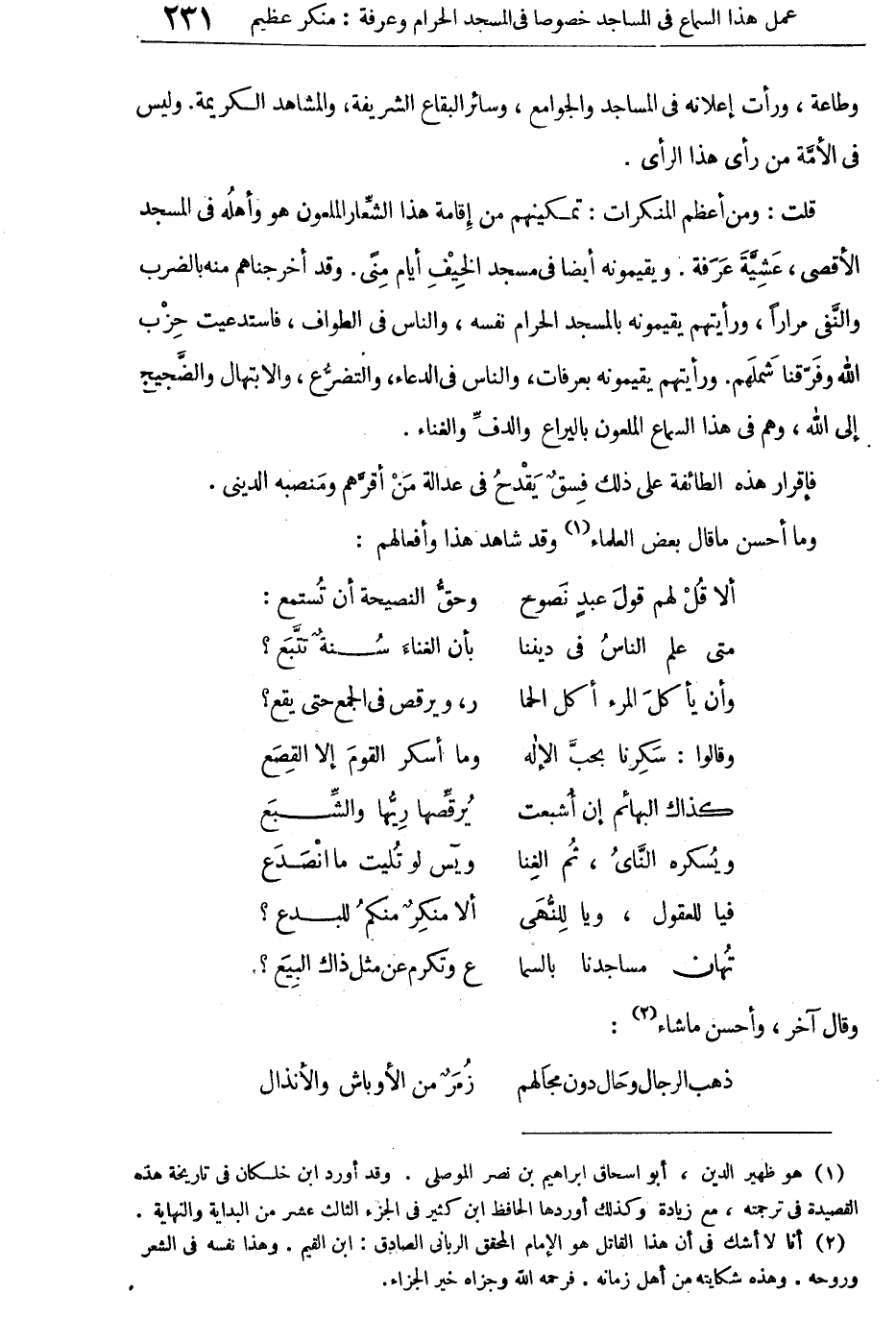 قلت: ومن أعظم المنكرات: تمكينهم من إقامة هذا الشعار الملعون هو وأهله فى المسجد الأقصى، عشية عرفة. ويقيمونه أيضاً فى، مسجد الخيف أيام منى. وقد أخرجناهم منه بالضرب والنفى مراراً، ورأيتهم يقيمون بالمسجد الحرام نفسه والناس فى الطواف، فاستدعيت حزب الله وفرقنا شملهم. ورأيتهم يقيمون بعرفات، والناس فى الدعاء، والتضرع، والابتهال والضجيج إلى الله، وهم فى هذا السماع الملعون باليراع والدف والغناء.