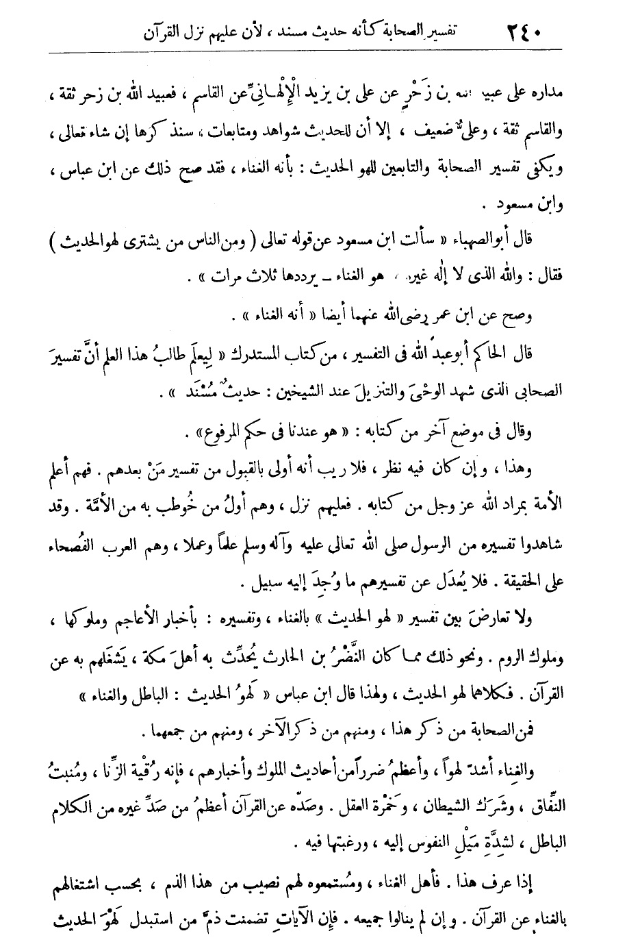 ولا تعارض بين تفسير "لهو الحديث" بالغناء، وتفسيره: بأخبار الأعاجم وملوكها، وملوك الروم، ونحو ذلك مما كان النضر بن الحارث يحدث به أهل مكة، يشغلهم به عن القرآن، فكلاهما لهو الحديث، ولهذا قال ابن عباس: "لهو الحديث: الباطل والغناء".