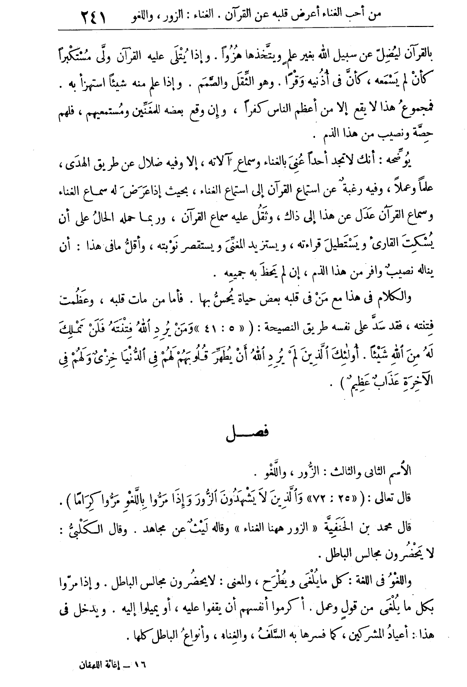 يوضحه: أنك لا تجد أحداً عنى بالغناء وسماع آلاته، إلا وفيه ضلال عن طريق الهدى، علماً وعملاً، وفيه رغبة عن استماع القرآن إلى استماع الغناء، بحيث إذا عرض له سماع الغناء وسماع القرآن عدل عن هذا إلى ذاك، وثقل عليه سماع القرآن، وربما حمله الحال على أن يسكت القارئ ويستطيل قراءته، ويستزيد المغنى ويستقصر نوبته، وأقل ما فى هذا: أن يناله نصيب وافر من هذا الذم، إن لم يحظ به جميعه