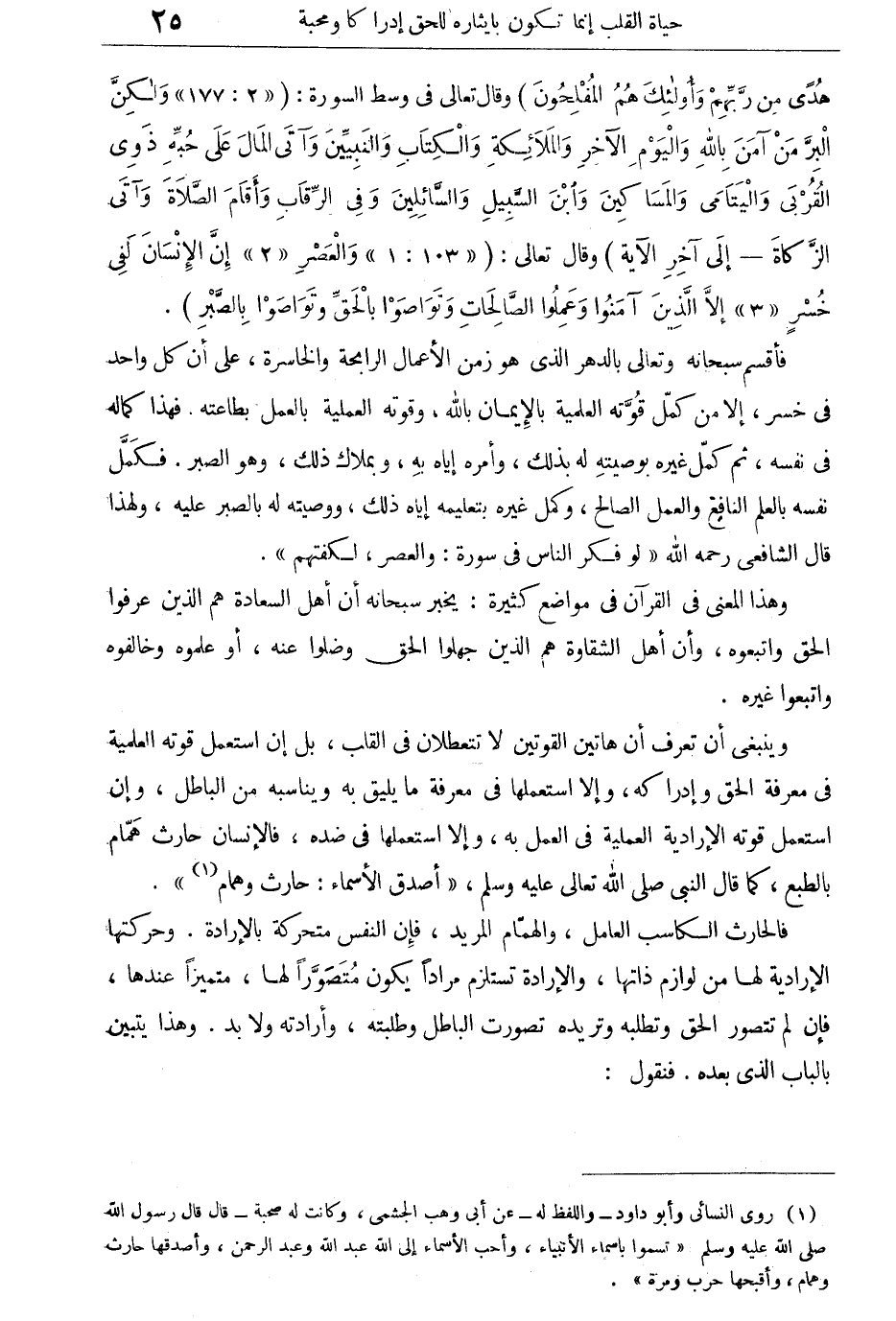 وينبغى أن يعرف أن هاتين القوتين لا تتعطلان فى القلب، بل إن استعمل قوته العلمية فى معرفة الحق وإدراكه، وإلا استعملها فى معرفة ما يليق به ويناسبه من الباطل، وإن استعمل قوته الإرادية العملية فى العمل به، وإلا استعملها فى ضده، فالإنسان حارث هَمَّام بالطبع، كما قال النبى صلى الله تعالى عليه وآله وسلم: "أَصْدَقُ الأَسْمَاءِ: حَارِثٌ وَهَمَّامٌ".