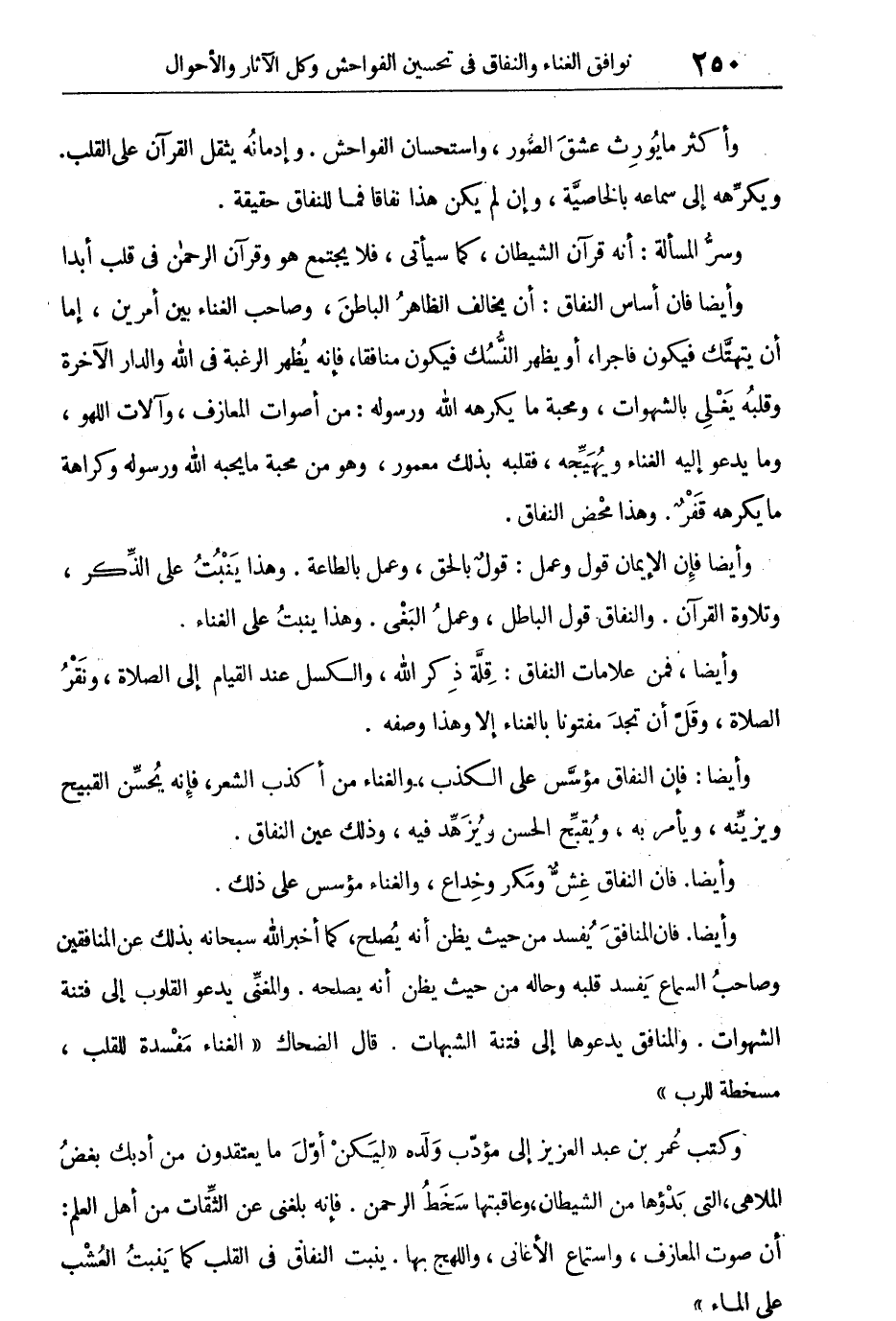 وأيضاً فإن أساس النفاق: أن يخالف الظاهر الباطن، وصاحب الغناء بين أمرين، إما أن يتهتك فيكون فاجراً، أو يظهر النسك فيكون منافقاً، فإنه يظهر الرغبة فى الله والدار الآخرة وقلبه يغلى بالشهوات، ومحبة ما يكرهه الله ورسوله من أصوات المعازف، وآلات اللهو، وما يدعو إليه الغناء ويهيجه، فقلبه بذلك معمور، وهو من محبة ما يحبه الله ورسوله وكراهة ما يكرهه قفر، وهذا محض النفاق.