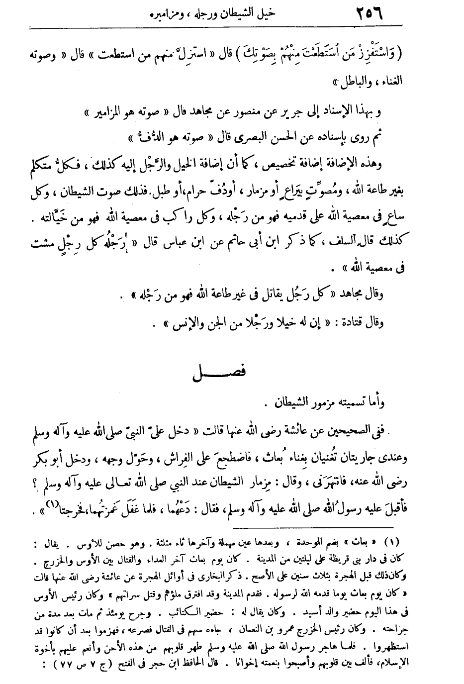 وهذه الإضافة إضافة تخصيص، كما أن إضافة الخيل والرجل إليه كذلك، فكل متكلم بغير طاعة الله، ومصوت بيراع أو مزمار، أو دف حرام، أو طبل، فذلك صوت الشيطان، وكل ساع فى معصية الله على قدميه فهو من رجله، وكل راكب فى معصية الله فهو من خيالته، كذلك قال السلف، كما ذكر ابن أبى حاتم عن ابن عباس قال: "رجله كل رجل مشت فى معصية الله".