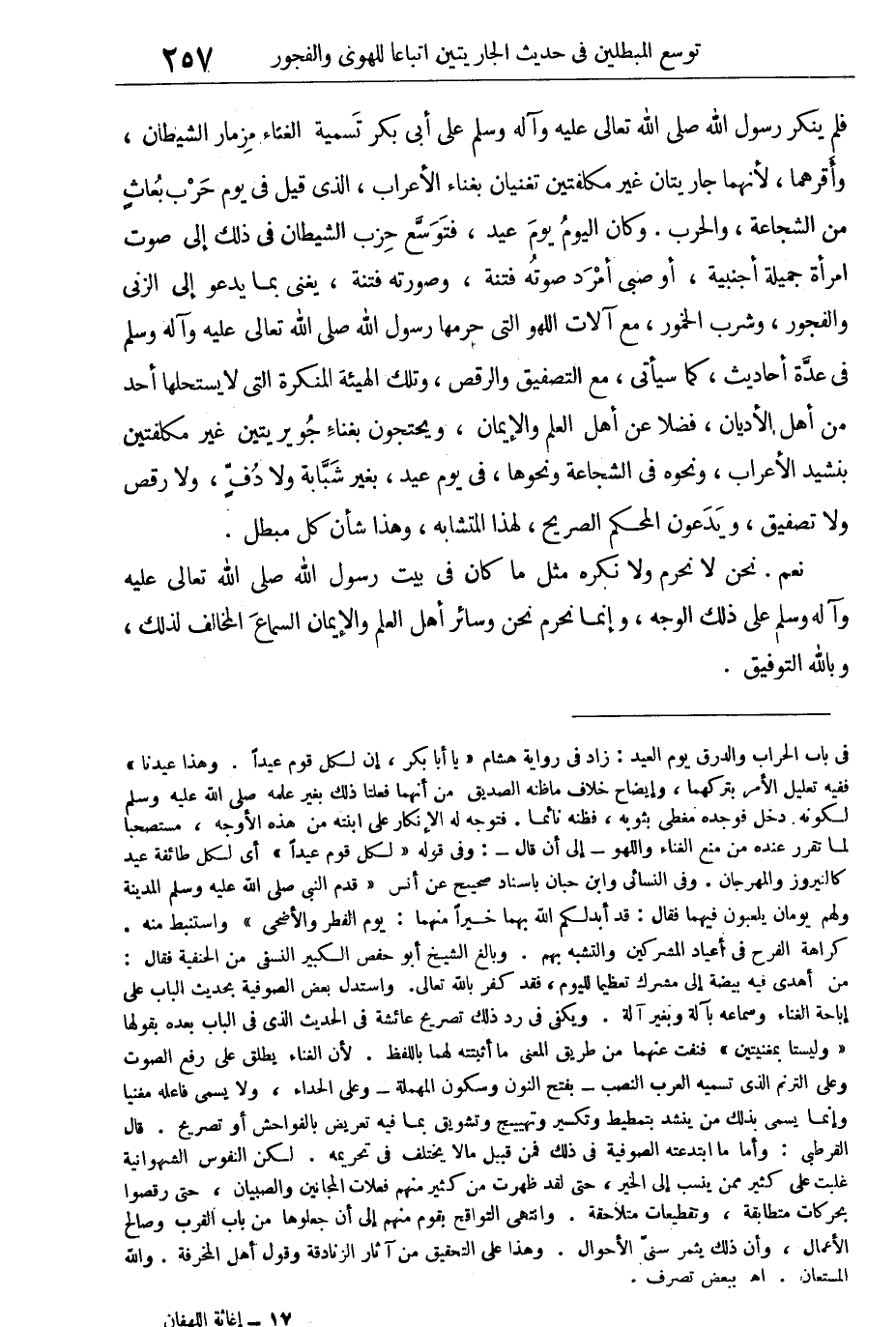 فلم ينكر رسول الله صلى الله تعالى عليه وآله وسلم على أبى بكر تسميته الغناء مزمار الشيطان، وأقرهما، لأنهما جاريتان غير مكلفتين تغنيان بغناء الأعراب، الذى قيل فى يوم حرب بعاث من الشجاعة، والحرب، وكان اليوم يوم عيد، فتوسع حزب الشيطان فى ذلك إلى صوت امرأة جميلة أجنبية، أو صبى أمرد صوته فتنة، وصورته فتنة، يغنى بما يدعو إلى الزنى والفجور، وشرب الخمور، مع آلات اللهو التى حرمها رسول الله صلى الله تعالى عليه وآله وسلم فى عدة أحاديث، كما سيأتى. مع التصفيق والرقص وتلك الهيئة المنكرة التى لا يستحلها أحد من أهل الأوثان، فضلاً عن أهل العلم والإيمان، ويحتجون بغناء جويريتين غير مكلفتين بنشيد الأعراب ونحوها فى الشجاعة ونحوها وفى يوم عيد، بغير شبابة ولا دف، ولا رقص ولا تصفيق، ويدعون المحكم الصريح، لهذا المتشابه وهذا شأن كل مبطل.