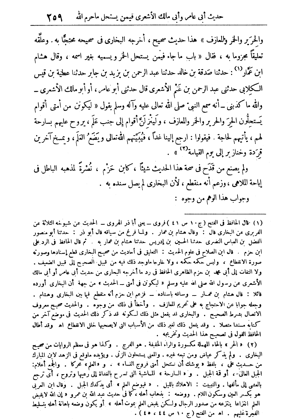 ولم يصنع من قدح فى صحة هذا الحديث شيئاً، كابن حزم، نصرة لمذهبه الباطل فى إباحة الملاهى، وزعم أنه منقطع، لأن البخارى لم يصل سنده به.