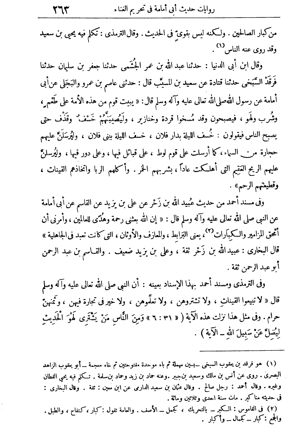 وفى "مسند" أحمد من حديث عبيد الله بن زحر عن على بن يزيد عن القاسم عن أبى أمامة عن النبى صلى الله تعالى عليه وآله وسلم قال: "إِنَّ اللهَ بَعَثَنِى رَحْمَةً وَهُدىً لِلْعَالمِينَ، وَأَمَرَنى أنْ أَمْحَقَ المَزَامِيرَ وَالْكِبَارَاتِ يَعْنِى البَرَابِطَ، وَالمَعَازِفَ وَالأَوْثَانَ، الّتِى كانَتْ تُعْبَدُ فى الْجَاهِلِيَّةِ".