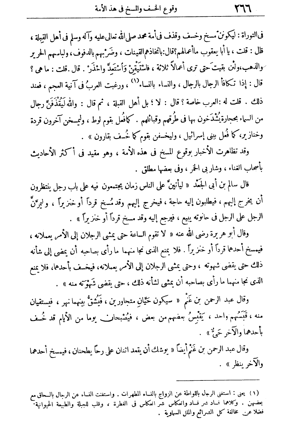 وقد تظاهرت الأخبار بوقوع المسخ فى هذه الأمة، وهو مقيد فى أكثر الأحاديث بأصحاب الغناء، وشرَّاب الخمر، وفى بعضها مطلق.