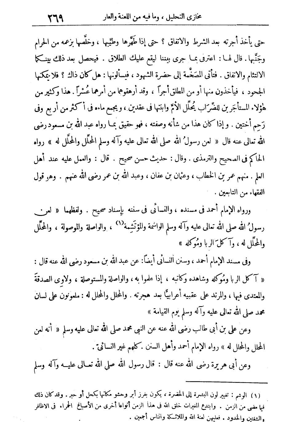 ورواه الإمام أحمد فى "مسنده"، والنسائى فى "سننه" بإسناد صحيح، ولفظهما "لَعَنَ رَسُولُ اللهِ صلّى اللهُ عليْهِ وَسلمَ الْوَاشِمَةَ والمُؤْتَشِمَةَ، وَالوَاصِلَةَ وَالمَوْصُولَةَ، وَالمُحَلِّلَ وَالمُحَلِّلَ لَهُ، وَآكِلَ الرِّبَا وَمُوكِلَهُ".