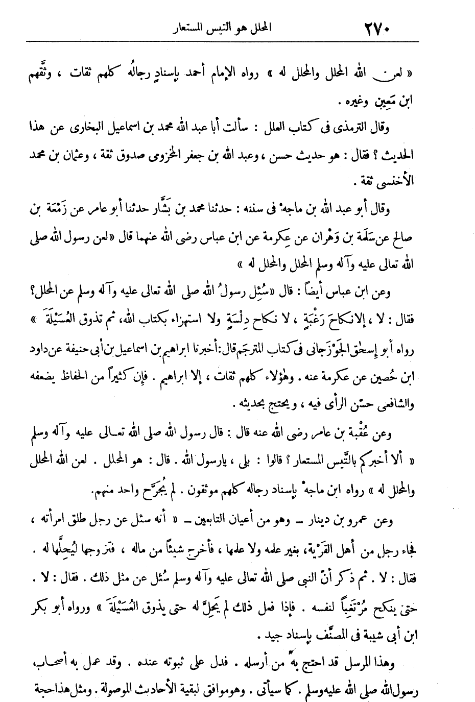 "أَلا أخْبِرُكُمْ بِالتَّيْسِ المُسْتَعَارِ؟ قَالُوا: بَلَى، يَا رَسُولَ اللهِ، قَالَ: هُوَ المُحَلِّلُ. لَعَنَ اللهُ المُحَلِّلَ وَالمَحَلَّلَ لَهُ".