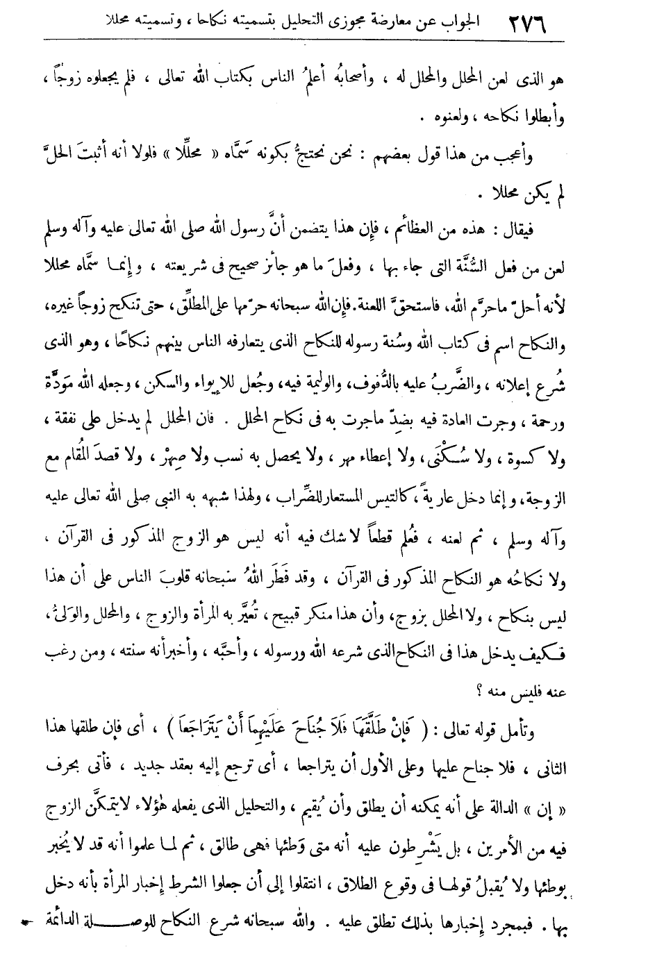 أى فإن طلقها هذا الثانى، فلا جناح عليها وعلى الأول أن يتراجعا، أى ترجع إليه بعقد جديد، فأتى بحرق "إن" الدالة على أنه يمكنه أن يطلق وأن يقيم، والتحليل الذى يفعله هؤلاء لا يتمكن الزوج فيه من الأمرين، بل يشرطون عليه أنه متى وطئها فهى طالق، ثم لما علموا أنه قد لا يخبر بوطئها ولا يقبل قولها فى وقوع الطلاق، انتقلوا إلى أن جعلواً الشرط إخبار المرأة بأنه دخل بها، فبمجرد إخبارها بذلك تطلق عليه، والله سبحانه أنه شرع النكاح للوصلة الدائمة