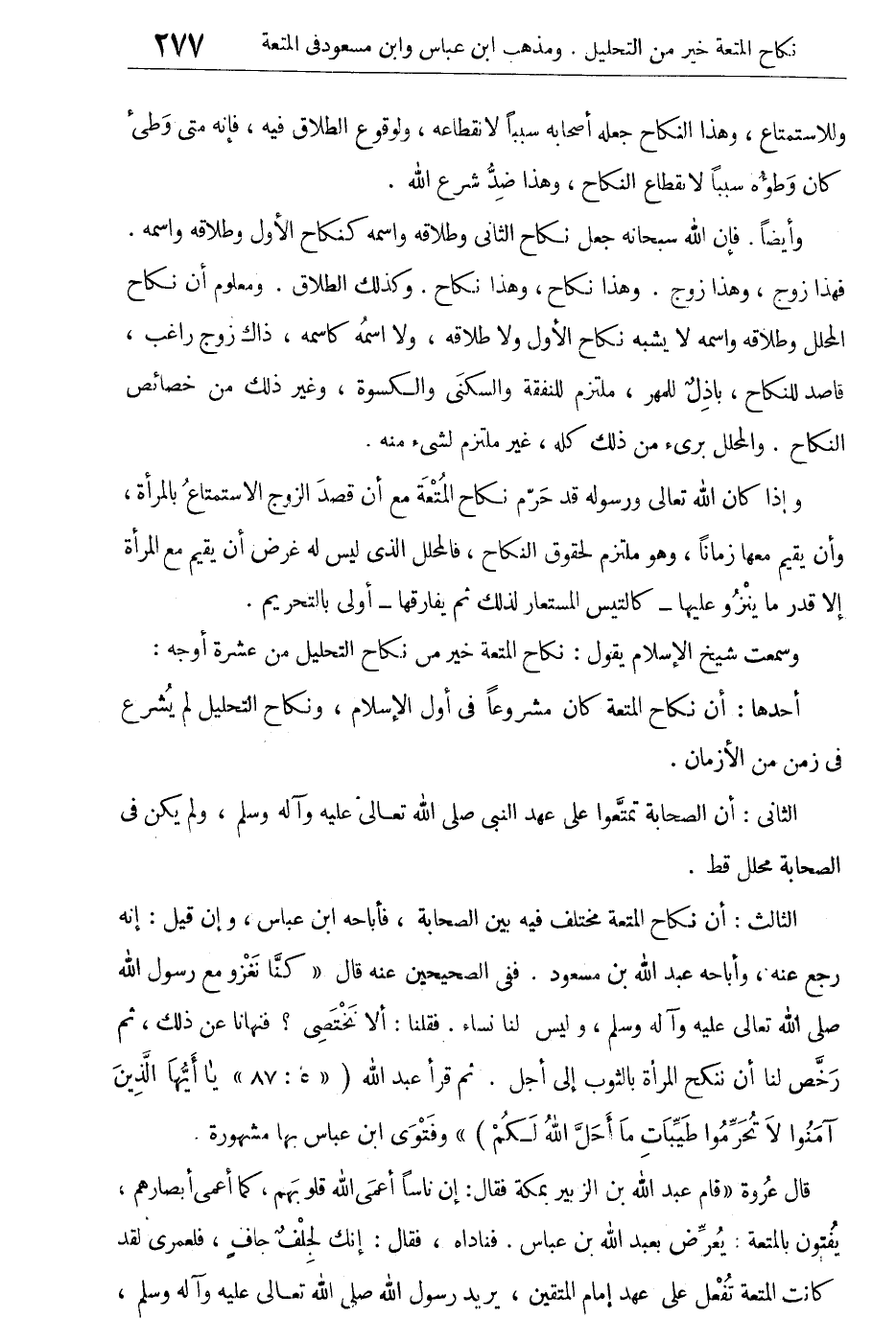 الثالث: أن نكاح المتعة مختلف فيه بين الصحابة، فأباحه ابن عباس، وإن قيل: إنه رجع عنه، وأباحه عبد الله بن مسعود. ففى "الصحيحين" عنه قال: "كُنَّا نَغْزُو مَعَ رَسُولِ اللهِ صلى اللهُ تعالى عليه وآله وسلم، وَلَيْسَ لَنَا نِسَاءٌ، فَقُلْنَا: أَلا نَخْتَصِى؟ فَنَهانَا عَنْ ذلِكَ، ثُمَّ رَخّصَ لَنَا أَنْ نَنْكِحَ المَرْأَةَ بِالثّوْبِ إِلى أَجَلٍ".