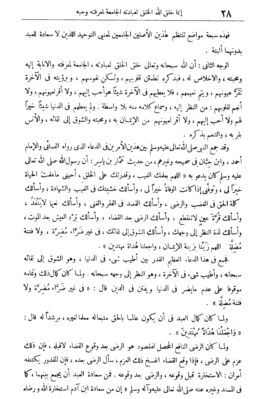 وقد جمع النبى صلى الله تعالى عليه وسلم بين هذين الأمرين فى الدعاء الذى رواه النسائى والإمام أحمد، وابن حبان فى صحيحه وغيرهم، من حديث عمار ابن ياسر: أن رسول الله صلى الله تعالى عليه وسلم كان يدعو به "اللهم بعلمك الغيب، وقدرتك على الخلق، أحينى ما علمت الحياة خيرا لى، وتوفنى إذا كانت الوفاة خيرا لى، وأسألك خشيتك فى الغيب والشهادة، وأسألك كلمة الحق فى الرضى والغضب، وأسألك القصد فى الفقر والغنى، وأسألك نعيما لا ينفد، وأسألك قرة عين لا تنقطع، وأسألك الرضى بعد القضاء، وأسألك برد العيش بعد الموت، وأسألك لذة النظر إلى وجهك، وأسألك الشوق إلى لقائك فى غير ضراء مُضِرَّة، ولا فتنة مضلة. اللهم زينا بزينة الإيمان، واجعلنا هداة مهتدين".