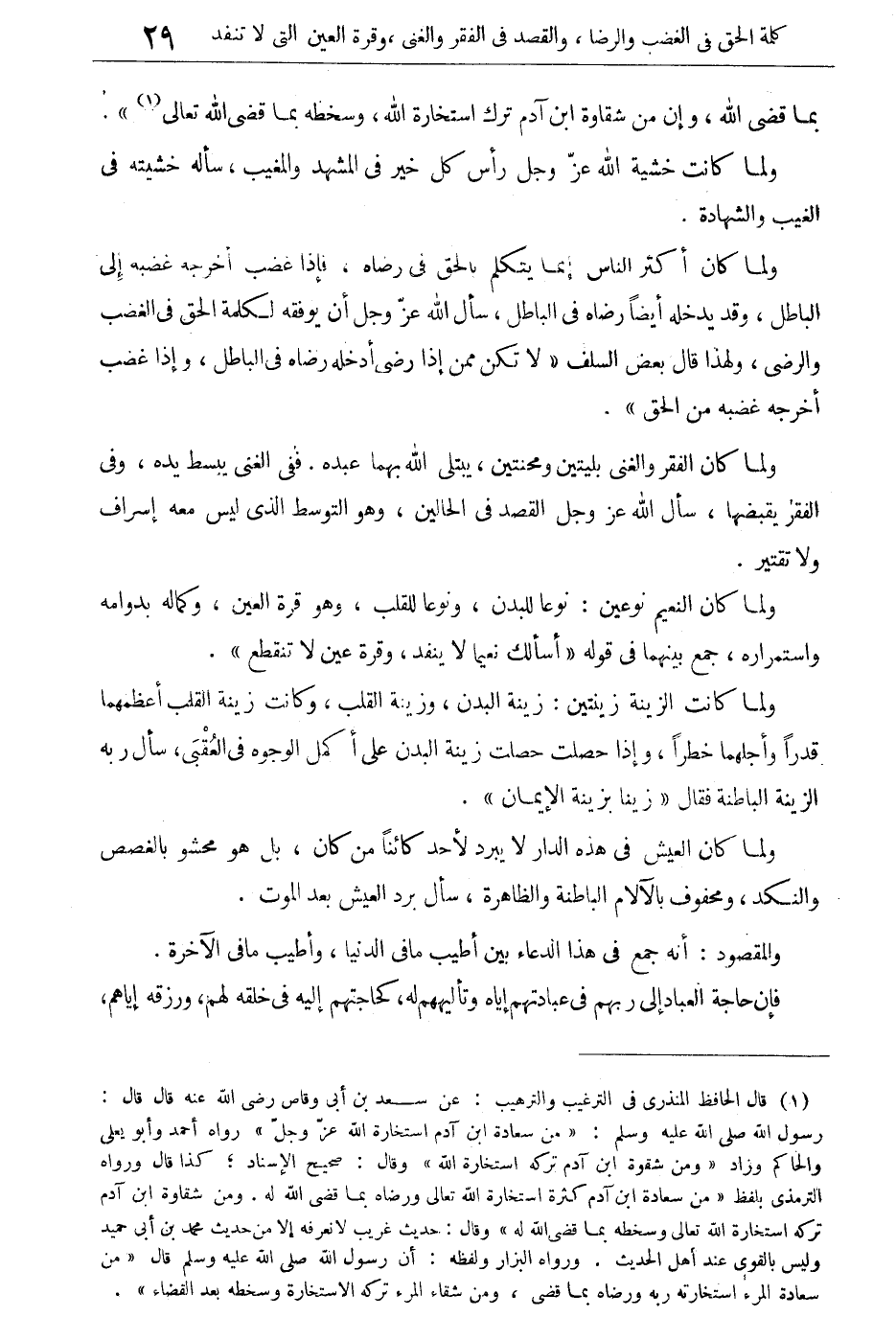 ولما كان أكثر الناس إنما يتكلم بالحق فى رضاه، فإذا غضب أخرجه غضبه إلى الباطل، وقد يدخله أيضاً رضاه فى الباطل، سأل الله عز وجل من توفيقه لكلمة الحق فى الغضب والرضى. ولهذا قال بعض السلف: لا تكن ممن إذا رضى أدخله رضاه فى الباطل، وإذا غضب أخرجه غضبه من الحق.