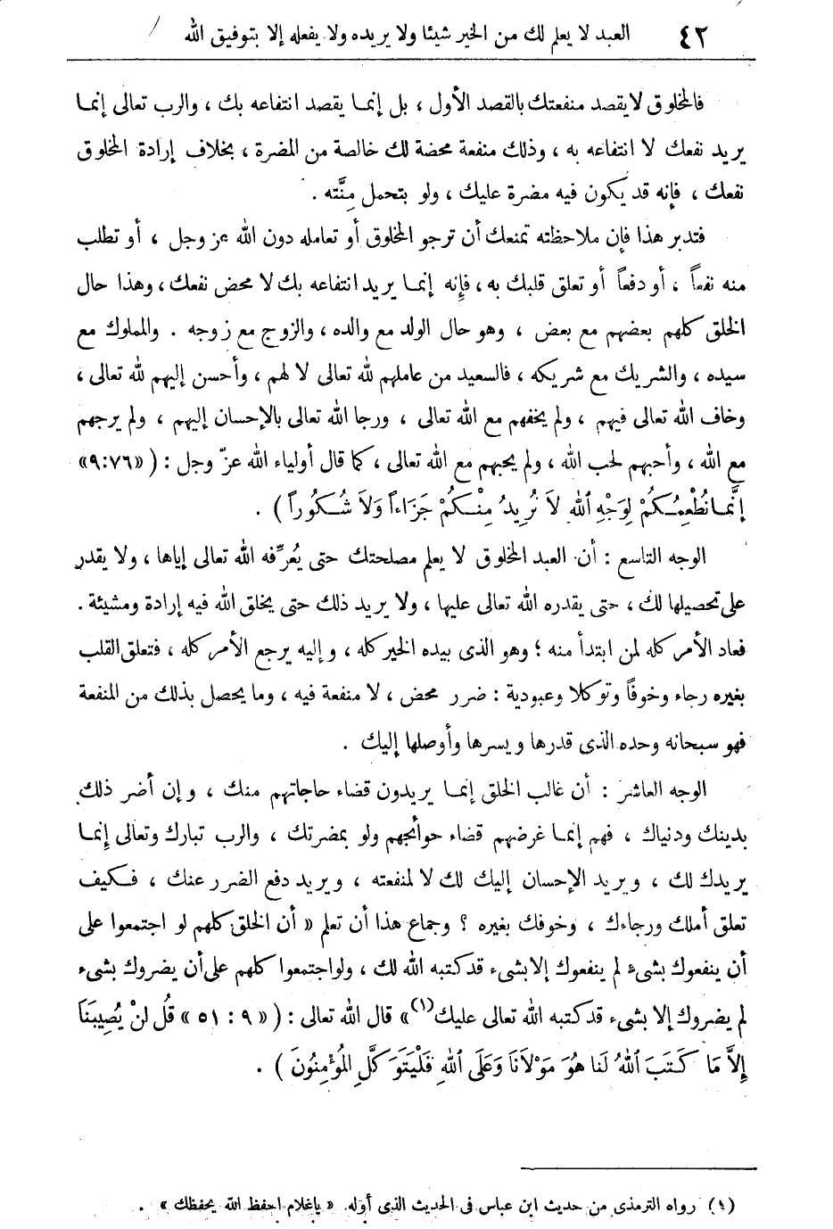 "أَنَّ الَخلْقَ كُلّهُمْ لَوِ اجْتَمَعُوا عَلَى أَنْ يَنْفَعُوكَ بِشَىْءٍ لَمْ يَنْفَعُوكَ إِلا بِشَىْءٍ قَدْ كَتَبَهُ اللهُ تَعَالَى لَكَ، ولَوِ اجْتَمَعُوا كُلُّهُمْ عَلَى أَنْ يَضُرُّوكَ بِشَىْءٍ لَمْ يَضُرُّوكَ إلا بشَىْءٍ قَدْ كَتَبَهُ اللهُ تَعَالَى عَلَيْكَ" قال تعالى: {قُلْ لَنْ يُصِيبَنَا إِلا مَا كَتَبَ اللهُ لَنَا هُوَ مَولانَا وَعَلَى اللهِ فَلْيَتَوَكَّلِ المُؤْمِنُونَ} [التوبة: 51] .