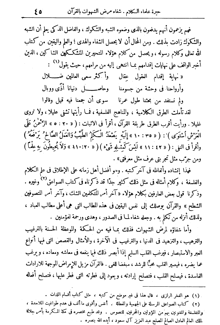 فهذا إنشاده وألفاظه فى آخر كتبه. وهو أفضل أهل زمانه على الإطلاق فى علم الكلام والفلسفة، وكلام أمثاله فى مثل ذلك كثير جدا قد ذكرناه فى كتاب الصواعق وغيره. وذكرنا قول بعض العارفين بكلام هؤلاء "آخر أمر المتكلمين الشك، وآخر أمر المتصوفين الشطح" والقرآن يوصلك إلى نفس اليقين فى هذه المطالب التى هى أعلى مطالب العباد، ولذلك أنزله من تكلم به. وجعله شفاء لما فى الصدور، وهدى ورحمة للمؤمنين.