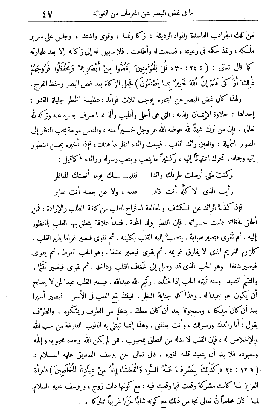 إحداها: حلاوة الإيمان ولذته، التى هى أحلى وأطيب وألذ مما صرف بصره عنه وتركه لله تعالى فإن من ترك شيئا لله عوضه الله عز وجل خيرا منه، والنفس مولعة بحب النظر إلى الصور الجميلة، والعين رائد القلب. فيبعث رائده لنظر ما هناك، فإذا أخبره بحسن المنظور إليه وجماله، تحرك اشتياقا إليه، وكثيرا ما يتعب ويتعب رسوله ورائده كما قيل: