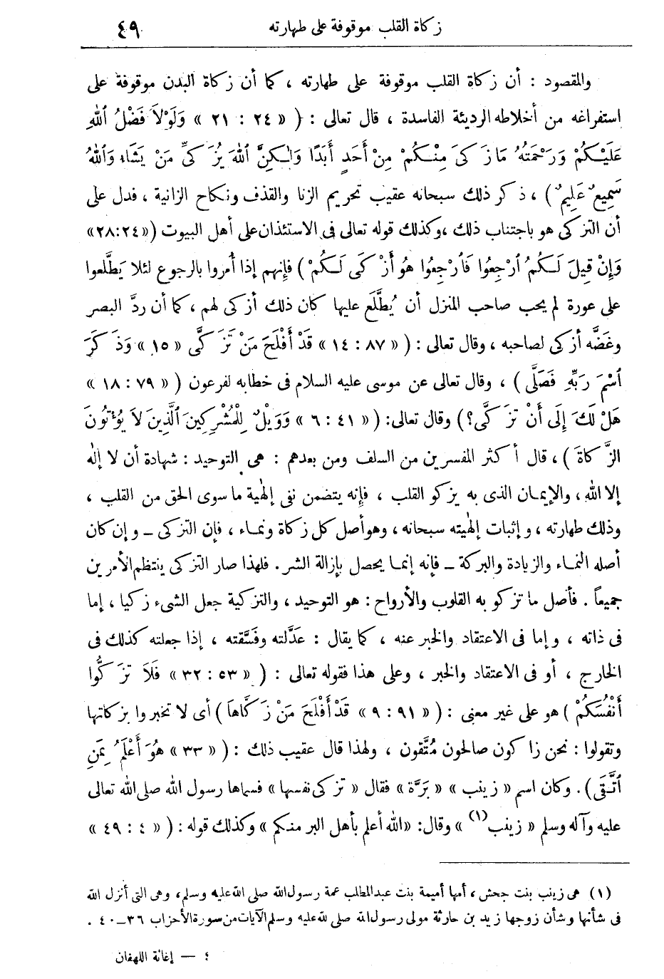 والمقصود: أن زكاة القلب موقوفة على طهارته، كما أن زكاة البدن موقوفة على استفراغه من أخلاطه الرديئة الفاسدة، قال تعالى: