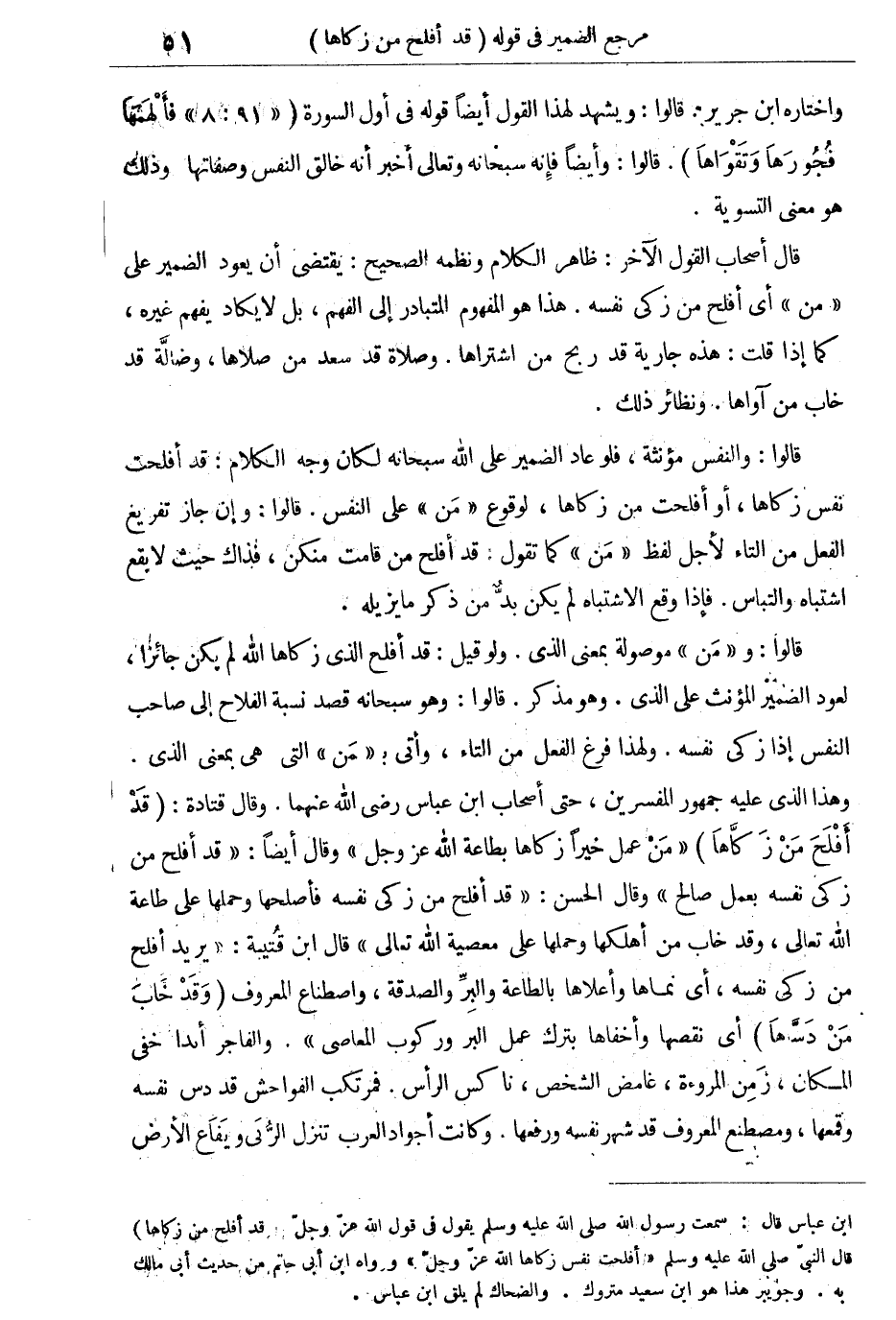 قالوا: والنفس مؤنثة، فلو عاد الضمير على الله سبحانه لكان وجه الكلام: قد أفلحت نفس زكاها، أو أفلحت من زكاها، لوقوع "مَن" على النفس. قالوا: وإن جاز تفريغ الفعل من التاء لأجل لفظ "من" كما تقول: قد أفلح من قامت منكن، فذاك حيث لا يقع اشتباه والتباس. فإذا وقع الاشتباه لم يكن بد من ذكر ما يزيله.