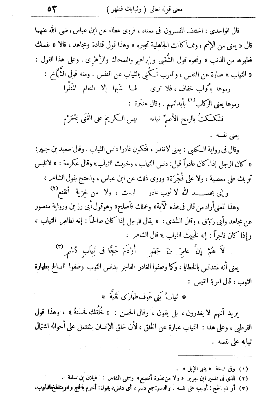 قال الواحدى: اختلف المفسرون فى معناه، فروى عطاء عن ابن عباس رضى الله عنهما قال "يعنى من الإثم، ومما كانت الجاهلية تجيزه" وهذا قول قتادة ومجاهد، قالا: "نفسك فطهرها من الذنب" ونحوه قول الشعبى وإبراهيم والضحاك والزهرى. وعلى هذا القول: "الثياب" عبارة عن النفس، والعرب تكنى بالثياب عن النفس ومنه قول الشماخ: