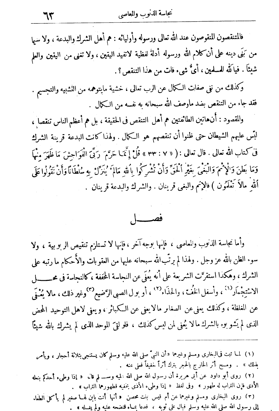 وأما نجاسة الذنوب والمعاصى، فإنها بوجه آخر، فإنها لا تستلزم تنقيص الربوبية، ولا سوء الظن بالله عز وجل. ولهذا لم يرتب الله سبحانه عليها من العقوبات والأحكام ما رتبه على الشرك، وهكذا استقرت الشريعة على أنه يعفى عن النجاسة المخففة، كالنجاسة فى محل الاستجمار، وأسفل الخف، والحذاء، وبول الصبى الرضيع وغير ذلك، مالا يعْفَى عن المغلظة.