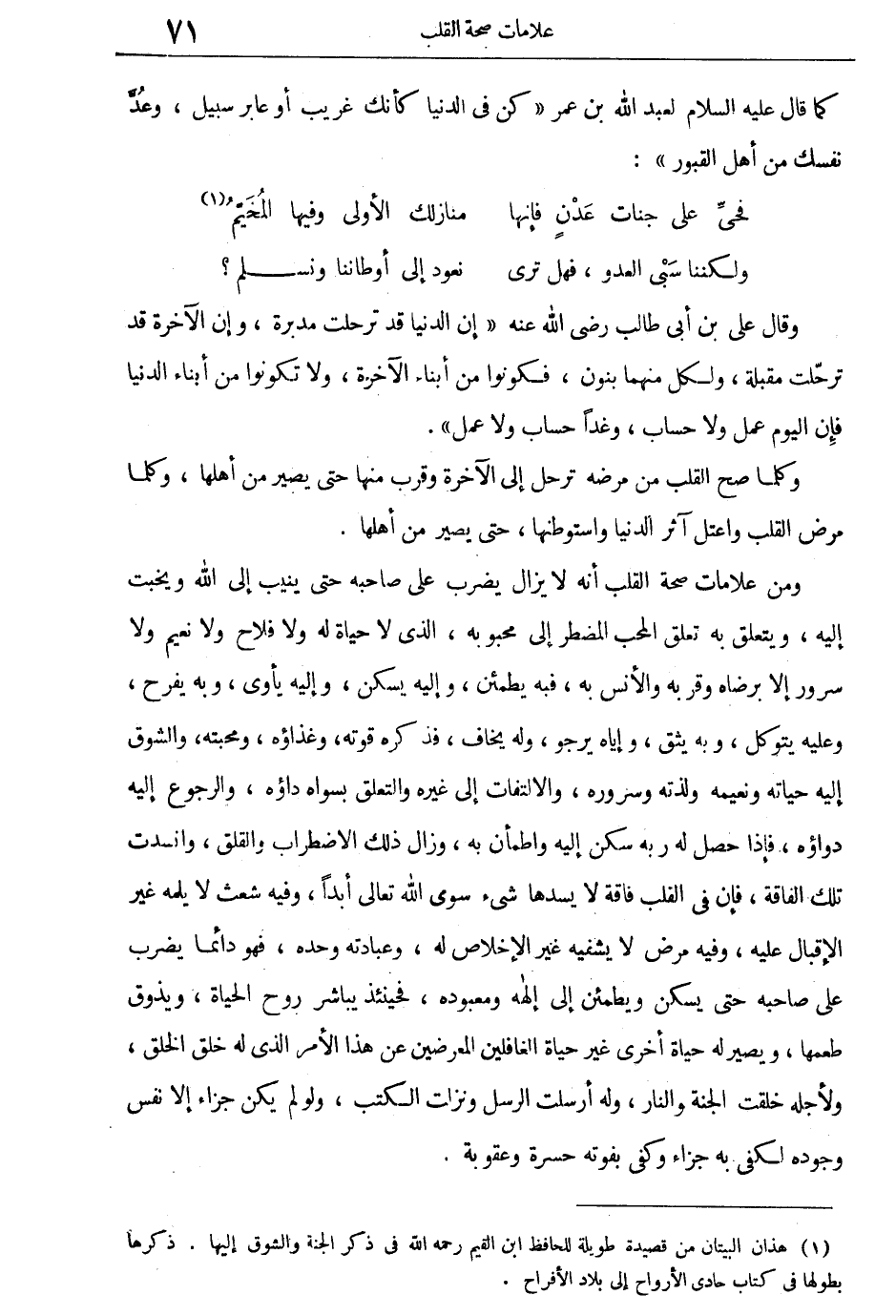 ومن علامات صحة القلب أنه لا يزال يضرب على صاحبه حتى ينيب إلى الله ويخبت إليه، ويتعلق به تعلق المحب المضطر إلى محبوبه، الذى لا حياة له ولا فلاح ولا نعيم ولا سرور إلا برضاه وقربه والأنس به، فبه يطمئن، وإليه يسكن، وإليه يأوى، وبه يفرح، وعليه يتوكل، وبه يثق، وإياه يرجو، وله يخاف. فذكره قوته وغذاؤه ومحبته، والشوق إليه حياته ونعيمه ولذته وسروره، والالتفات إلى غيره والتعلق بسواه داؤه، والرجوع إليه دواؤه، فإذا حصل له ربه سكن إليه واطمأن به وزال ذلك الاضطراب والقلق، وانسدت تلك الفاقة، فإن فى القلب فاقة لا يسدها شىء سوى الله تعالى أبدا، وفيه شعث لا يلمه غير الإقبال عليه، وفيه مرض لا يشفيه غير الإخلاص له، وعبادته وحده، فهو دائما يضرب على صاحبه حتى يسكن ويطمئن إلى إلهه ومعبوده، فحينئذ يباشر روح الحياة، ويذوق طعمها، ويصير له حياة أخرى غير حياة الغافلين المعرضين عن هذا الأمر الذى له خلق الخلق، ولأجله خلقت الجنة والنار، وله أرسلت الرسل ونزلت الكتب، ولو لم يكن جزاء إلا نفس وجوده لكفى به جزاء وكفى بفوته حسرة وعقوبة.