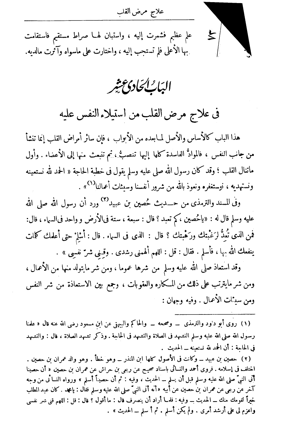 الباب الحادى عشر: فى علاج مرض القلب من استيلاء النفس عليه