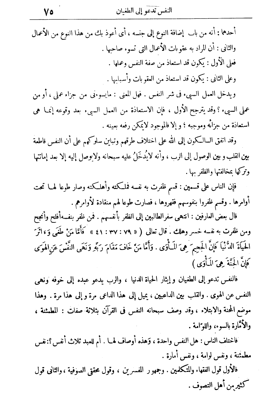 فالنفس تدعو إلى الطغيان وإيثار الحياة الدنيا، والرب يدعو عبده إلى خوفه ونهى النفس عن الهوى. والقلب بين الداعيين، يميل إلى هذا الداعى مرة وإلى هذا مرة وهذا موضع المحنة والابتلاء، وقد وصف سبحانه النفس فى القرآن بثلاث صفات: المطمئنة، والأمارة بالسوء، واللوامة.