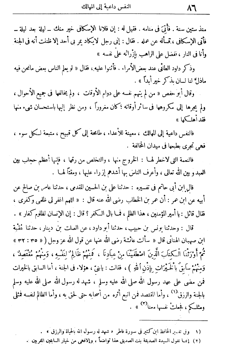 فالنفس داعية إلى المهالك، معينة للأعداء، طامحة إلى كل قبيح، متبعة لكل سوء؛ فهى تجري بطبعها فى ميدان المخالفة.