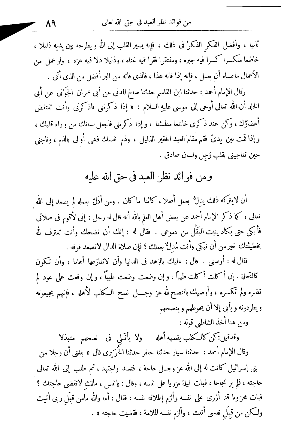 أن لا يتركه ذلك يُدِلُّ بعمل أصلا كائنا ما كان، ومن أدلَّ بعمله لم يصعد إلى الله تعالى كما ذكر الإمام أحمد عن بعض أهل العلم بالله أنه قال له رجل: "إني لأقوم في صلاتى؛ فأبكى حتى يكاد ينبت البقل من دموعى؛ فقال له: إنك إن تضحك وأنت تعترف لله بخطيئتك خير من أن تبكى وأنت مدل بعملك. فإن صلاة المُدلِّ لا تصعد فوقه. فقال له: أوصنى، قال: عليك بالزهد فى الدنيا، وأن لا تنازعها أهلها، وأن تكون كالنحلة إن أكلت أكلت طيبا، وإن وضعت وضعت طيبا، وإن وقعت على عود لم تضره ولم تكسره، وأوصيك بالنصح لله عز وجل نصح الكلب لأهله، فإنهم يجيعونه ويطردونه ويأبى إلا أن يحوطهم، وينصحهم".