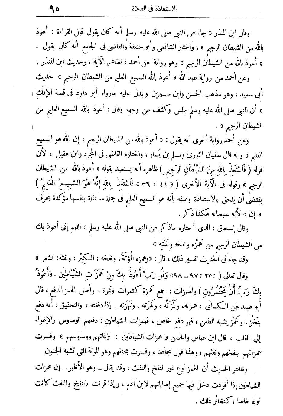وقال ابن المنذر: "جَاءَ عَن النبىِّ صلى الله عليه وسلم أَنّهُ كانَ يَقُولُ قَبْلَ الْقِرَاءَةِ: أعُوذُ بِاللهِ مِنَ الشّيْطَانِ الرَّجِيمِ".