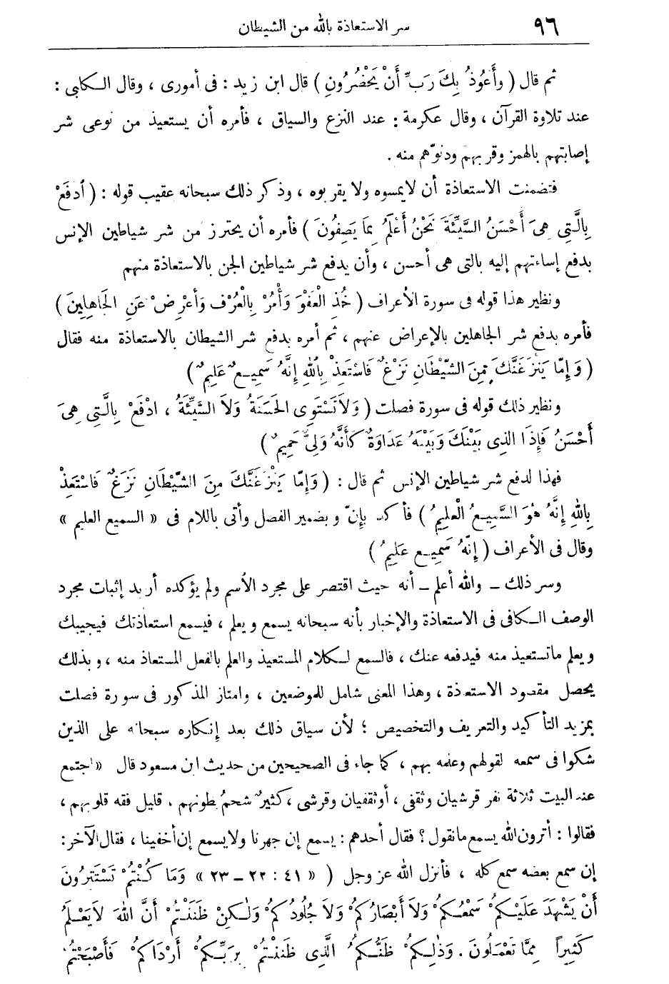 فتضمنت الاستعاذة أن لا يمسوه ولا يقربوه، وذكر ذلك سبحانه عقيب قوله: {ادْفَعْ بِالتِى هِىَ أَحْسَنُ السَّيَئةَ نَحْنُ أَعْلَمُ بمَا يصِفُونَ} [المؤمنون: 96] .